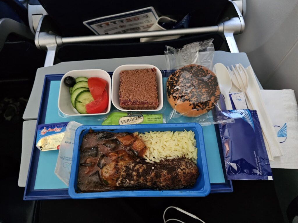 Opting for the beef, I was soon handed a tray that contained the main dish alongside a simple side salad that consisted of unseasoned cucumbers, tomatoes and olives, a packaged bread roll with margarine, a block of gouda cheese and a small square sponge cake for dessert. As I peeled the lid back from the main dish, I discovered this to be beef kofta in a mystery sauce and was accompanied by a small portion of rice. Soon getting to work on this, whilst by no means being Michelin star cuisine, the meal was perfectly edible, and the quantity left me with no qualms given the length of the flight. Around twenty minutes after handing out the main meals, the crew took to the aisles once more and collected the empty trays whilst handing out teas and coffees. Opting for the latter, this was poured into a nicely branded paper cup and was of standard quality for an inflight coffee.