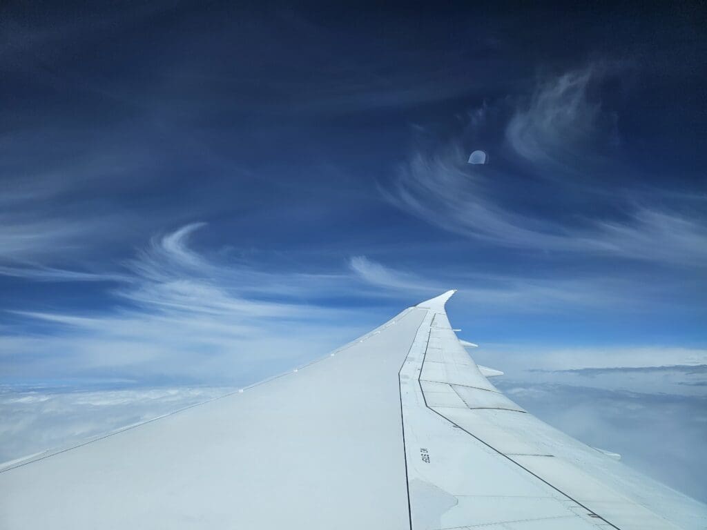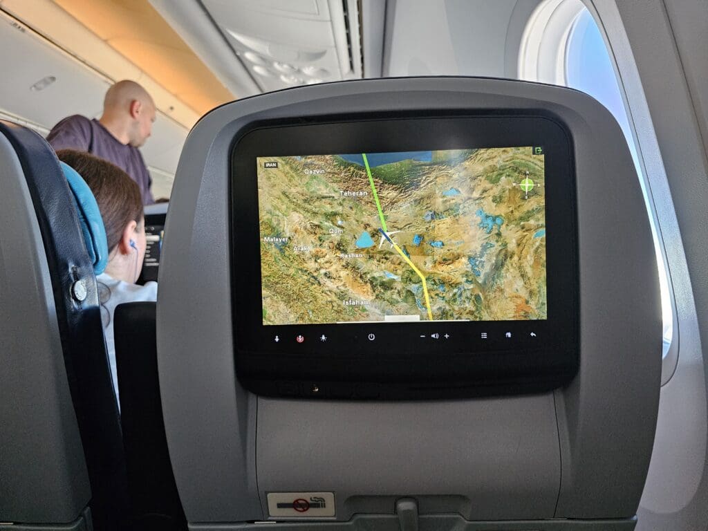 During my trip to the lavatory, I spotted a few vacant rows in the Dreamliner’s forward Economy section and thus, wanting to bag a ‘real’ window seat, I decided to move forward to Seat 15L, located in the second row of this cabin. Granted, whilst the view from this seat was largely blocked by the wing, I was still thankful to be in a ‘real’ window seat as we cruised northwestwards through the Iranian skies. By this time, the aircraft was well over halfway into its voyage and we were nearing the Iranian capital, Tehran, passing just to the east of this. Back inside the cabin, once the meal service had been completed, the crew took the galleys and were almost entirely absent from the aisles until they emerged to commence their pre-arrival checks.