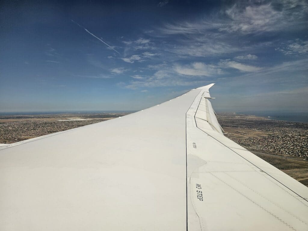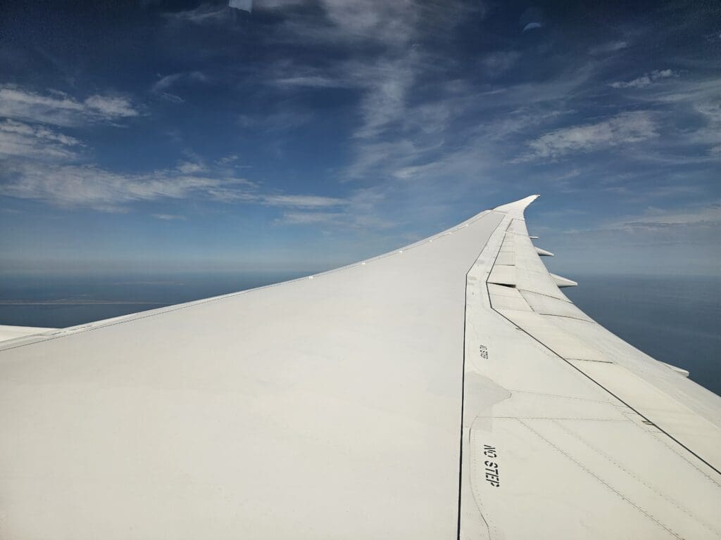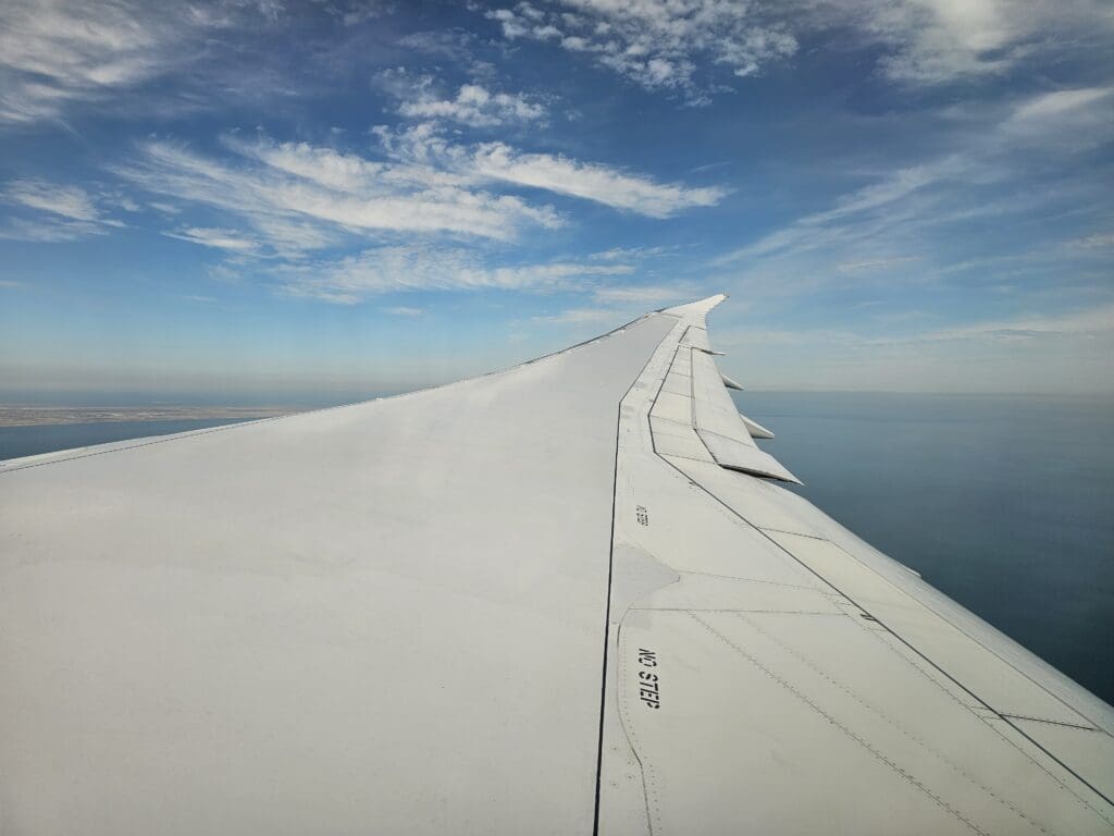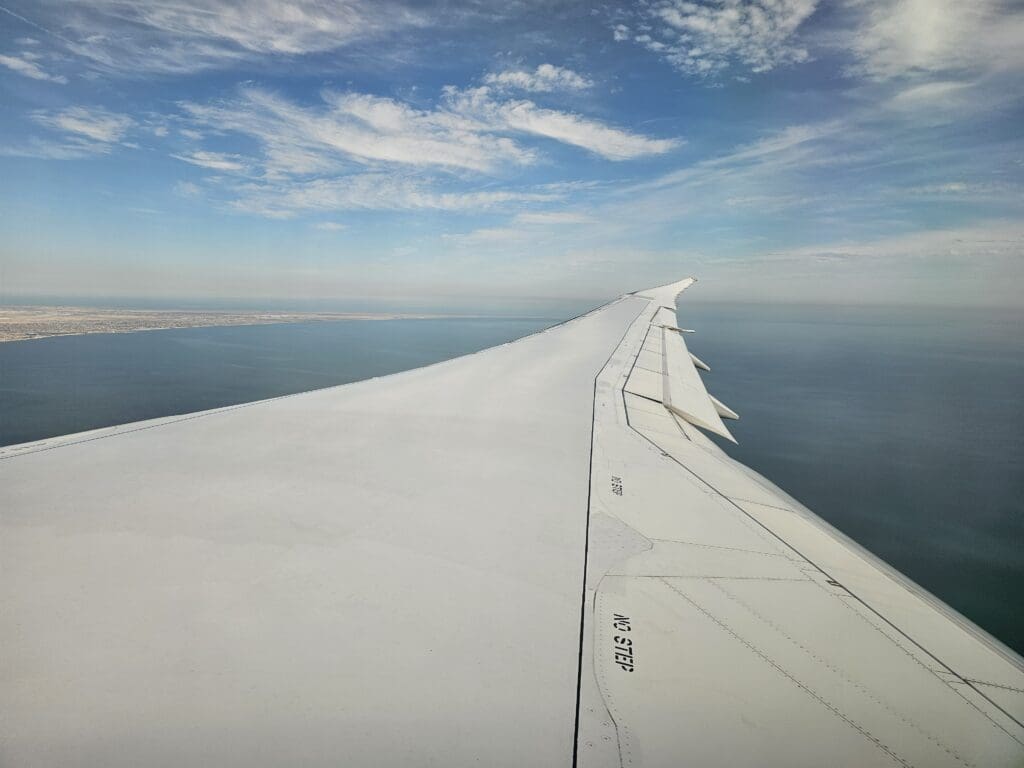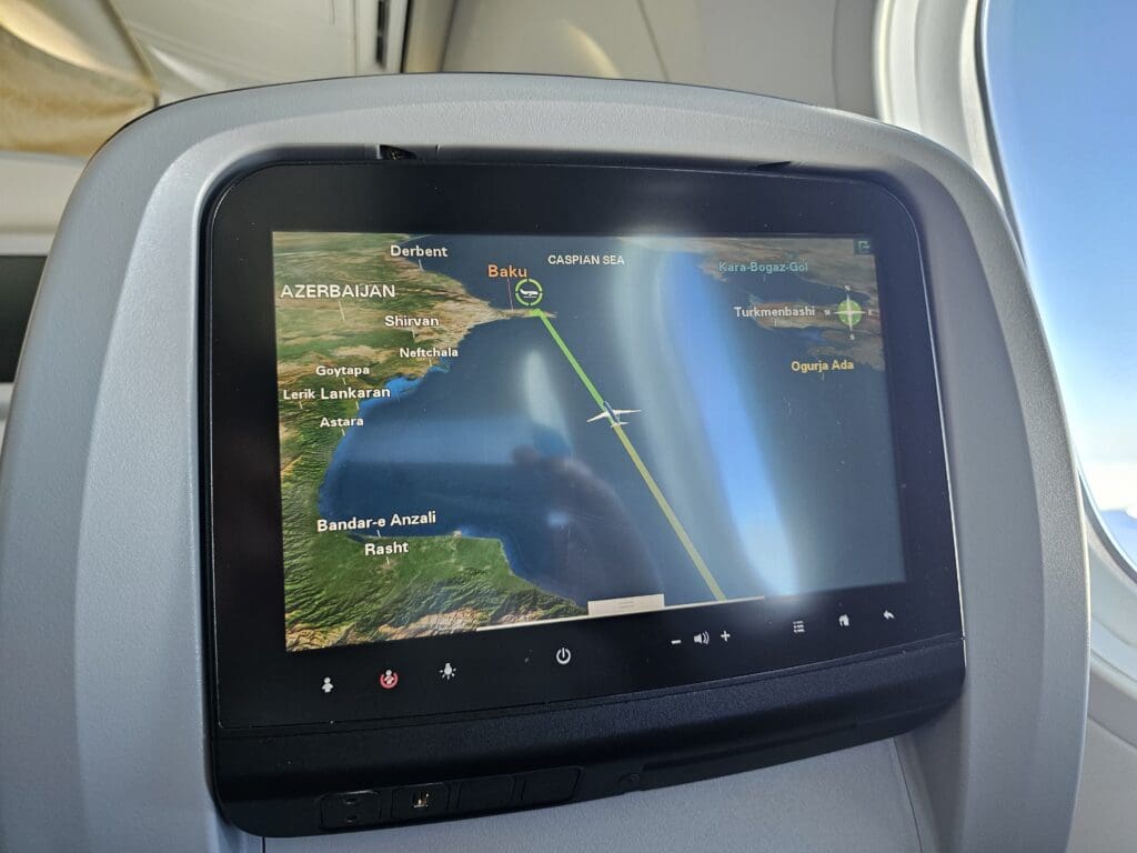 Following a smooth crossing of Iran that lasted an hour and twenty minutes, the Dreamliner cut across the city of Chalus in the country’s green Mazandaran region and made its way over the blue waters of the Caspian Sea. Ten minutes later, the aircraft could be felt commencing its descent, and perhaps wanting to get everything in place and secure for our arrival as soon as possible, the Purser soon performed their pre-arrival announcement in Azerbaijani, Russian and English, after which the crew passed through the cabin ensuring that all was secure and in place. Thankfully, during this time, the crew either failed to notice that I had moved to the new window seat or simply did not care! Either way, I strapped myself in and remained in my new seat as we slowly headed downwards and crossed into Azerbaijani skies.