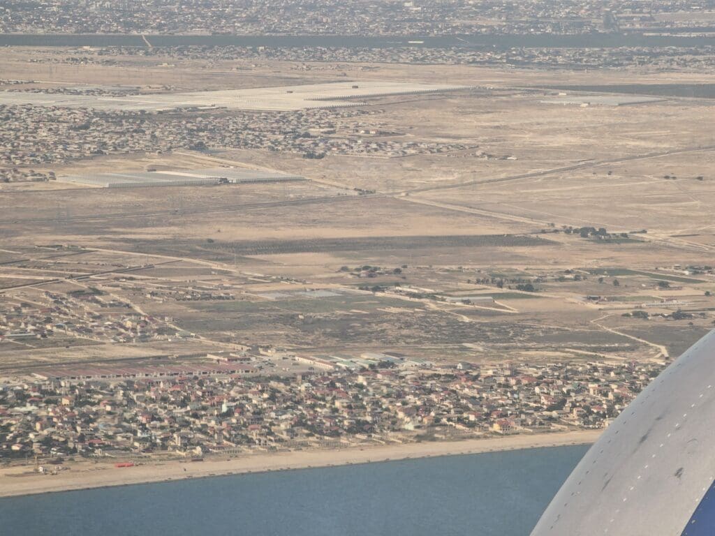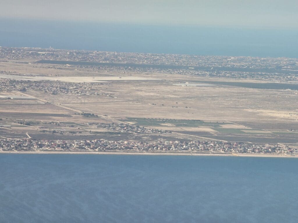 Sinking downwards, little could be seen for much of our descent, and landing on one of Baku Airport’s northerly runways, Runway 34 to be precise, very little turning was required to line us up for an approach to this. As we descended, eventually, the southernmost tip of the Absheron Peninsula, Shahdili, popped into view as our flaps were partially extended in preparation for our arrival. Continuing heading downwards, soon, the Dreamliner crossed over the built-up coastline at Hovsan before descending over the arid-looking semi-rural areas surrounding the airport.