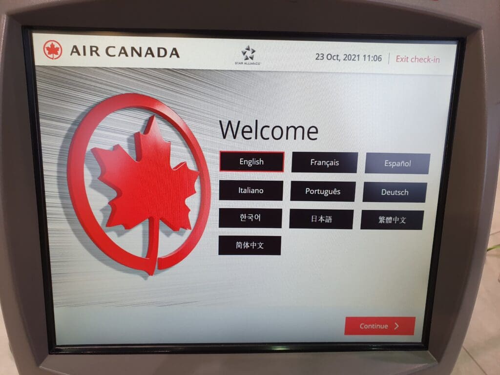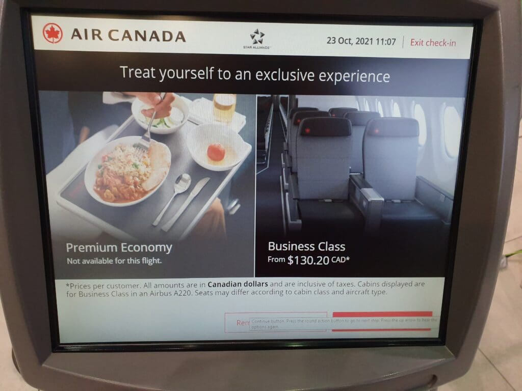 From the arrivals area, I voyaged up to the departure level and found myself standing in the well-branded WestJet area of Calgary Airport’s modern and spacious semi-circular check-in hall. Whilst I had no luggage to check in and already in possession of a boarding pass, I could have gone straight through to security, however, I instead decided to head over to Air Canada’s check-in area to print off a paper boarding pass from one of the self check-in machines. Interestingly, at that time in the morning, the terminal was almost completely deserted with a far greater number of airport staff seen milling around than passengers. Walking up to one of the self check-in machines at Air Canada’s largely staffless portion of the check-in hall, I entered my reservation code and agreed not to transport any prohibited items before being presented with the option to upgrade for $130.20. Rejecting this, my boarding pass emerged from the machine revealing that my flight would depart from Gate C54 and that boarding would commence 35 minutes before departure at 1425.