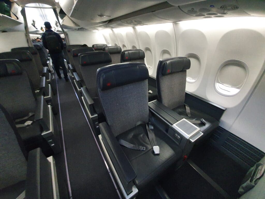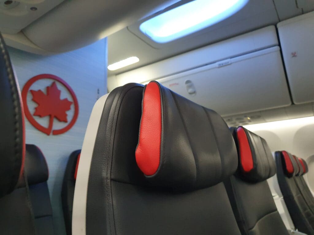 Turning right, I entered the faint blue mood lightning-tinged 169-seat cabin. Air Canada’s Boeing 737 MAX 8s feature five fewer seats than those of their rival, WestJet, whose aircraft feature one less row in Business. Entering the Business cabin, this consisted of four rows of grey fabric-covered recliner seats in a 2-2 configuration. These are identical to those onboard Air Canada’s Airbus A220 jets and take the form of Collins Aerospace’s MiQ cradle seats, which, in my opinion, appear to be a cross between a premium economy seat and a more traditional business class recliner. With that considered, whilst sufficient for the short domestic hops, I can imagine that they may attract some complaints from those in Business on the aircraft’s transatlantic and transcontinental services. Nevertheless, as a European, these seemed to be a step up from the vast majority of premium products on short narrowbody operated services back home!