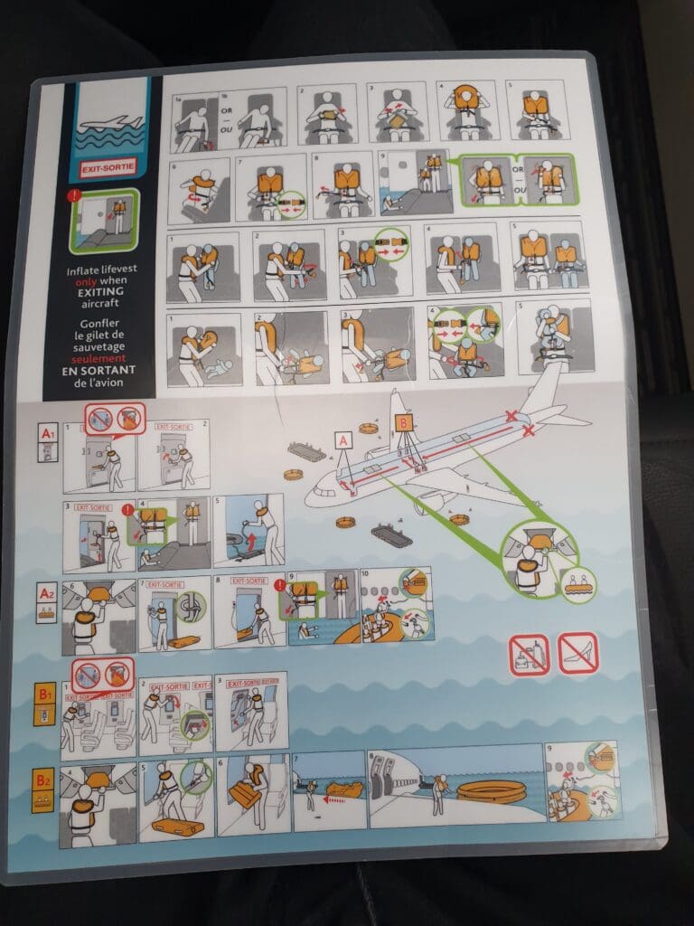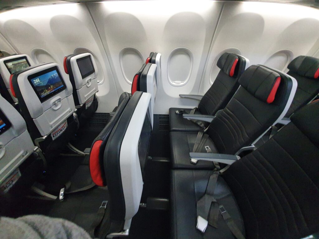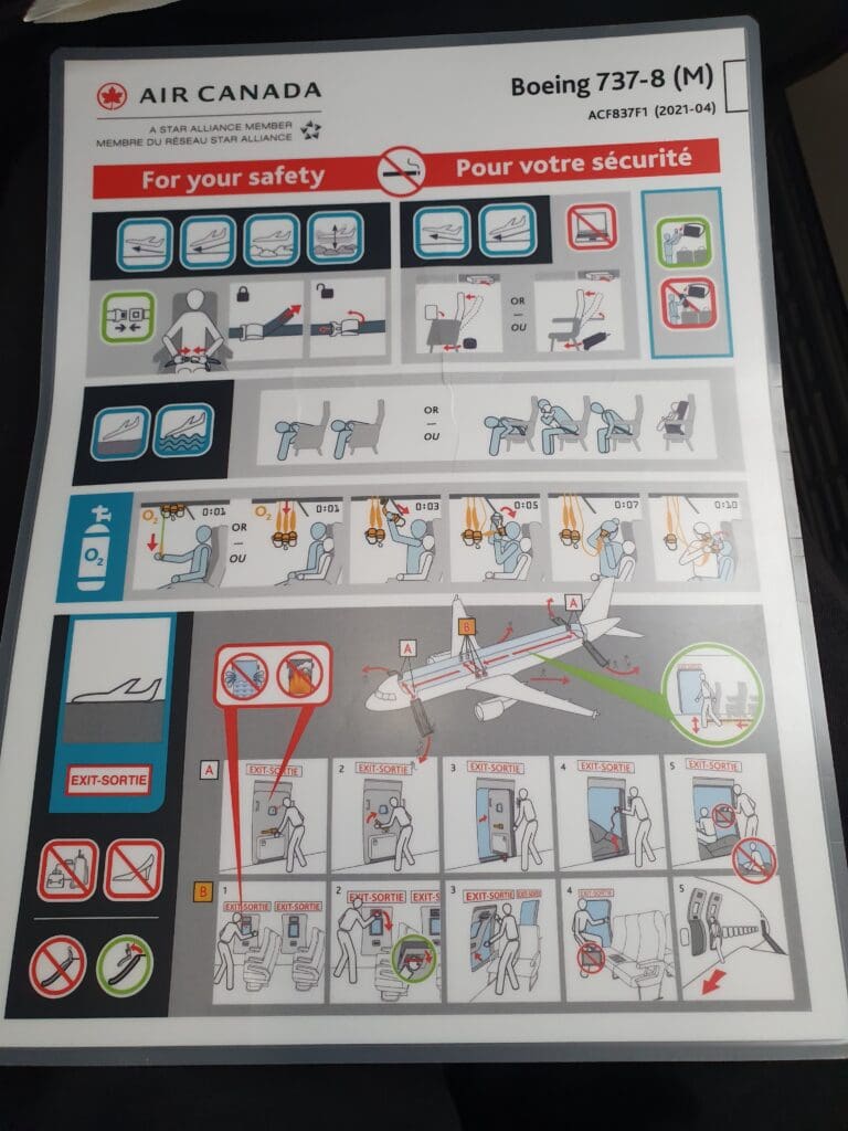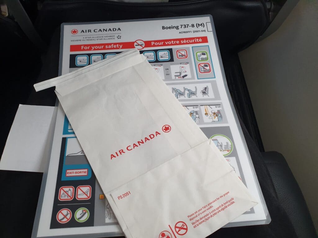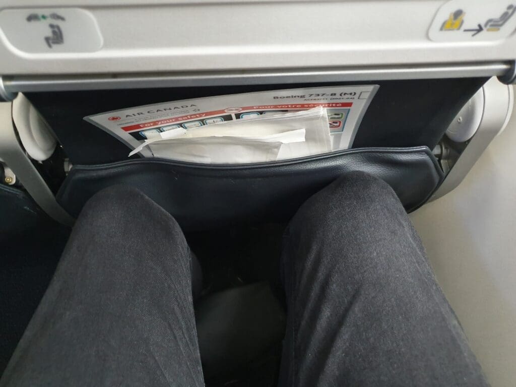 Quickly passing through the mostly empty Business cabin, I soon entered the 153-seat Economy section where I received a lukewarm greeting from a flight attendant standing in one of the forwardmost rows of this cabin. In Economy, all seats take the form of Collins Aerospace Meridian slimline seats and are covered in dark (faux?) leather adorned with horizontal lines of red stitching and topped with an adjustable headrest. On the rear of each seat, a high-quality 10-inch wide inflight entertainment screen powered by Panasonic Avionics’ eX1 inflight entertainment system could be found along with a USB-A port. Meanwhile, two plug sockets are present for every three seats. Turning to the seatback pocket, this contained an Air Canada branded sickbag, as well as a safety card that slyly listed the aircraft type as a Boeing 737-8 (M).