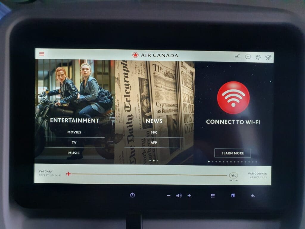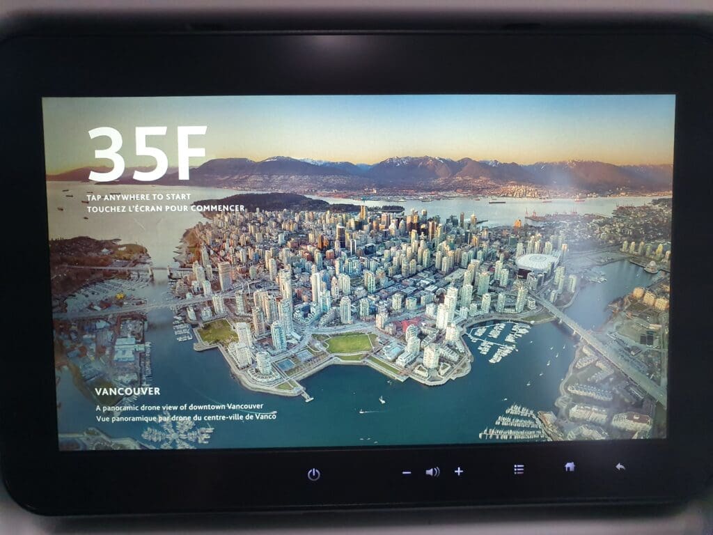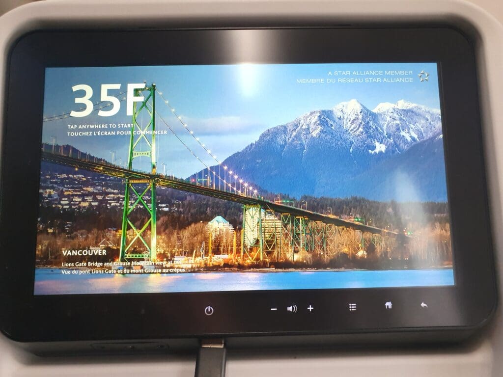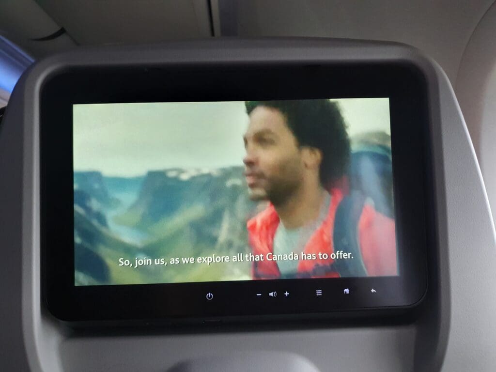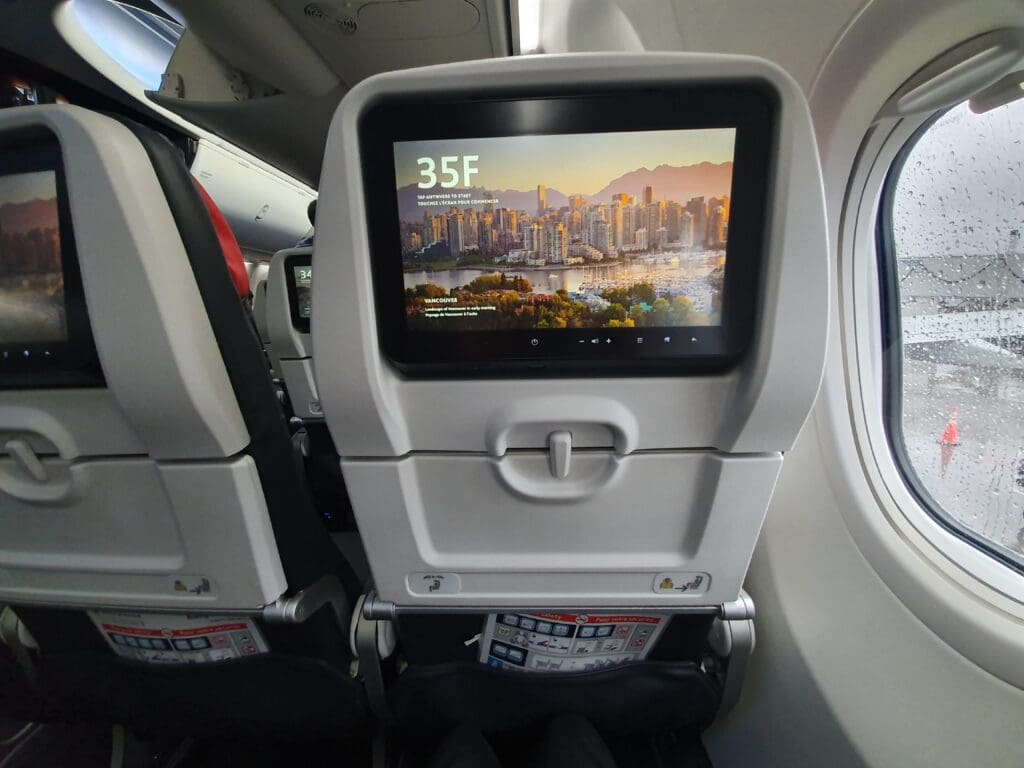 That afternoon, boarding was a fairly quick process and at 1442, the words ‘boarding complete’ rang out through the cabin. At this time I was delighted to see that the two seats next to mine remained empty and I would estimate the aircraft to have been around 70% full. Examining the demographics of the flight, this appeared to be a reasonable mixture of solo flyers, families and friends, as well as several deadheading crew members making their way to and from work. After a couple of minutes, the lights were dimmed and the Cabin Director performed a somewhat unenthusiastic-sounding welcome announcement in English and French. This featured the usual welcome and word of thanks for flying Air Canada, as well as the instructions regarding seatbelts and facemasks. As soon as the announcement came to an end, the inflight entertainment system temporarily became unusable as the airline’s Ode to Canada safety video was played. During this, an impressive eleven minutes ahead of schedule, the aircraft could be felt being pushed back away from the terminal.