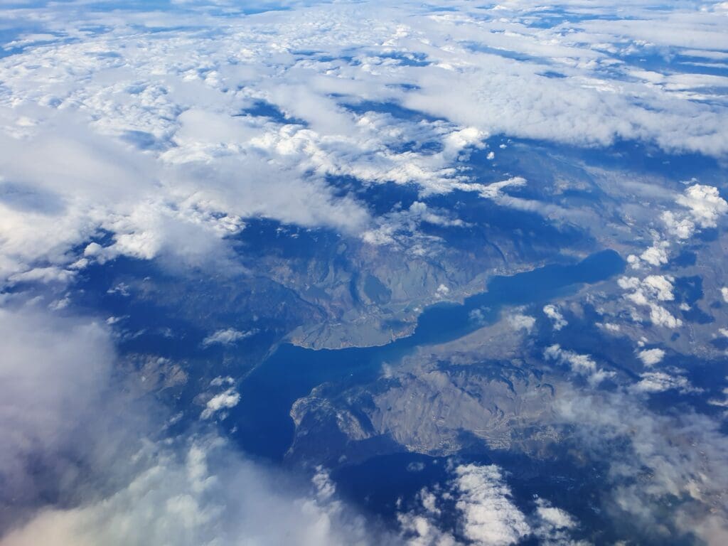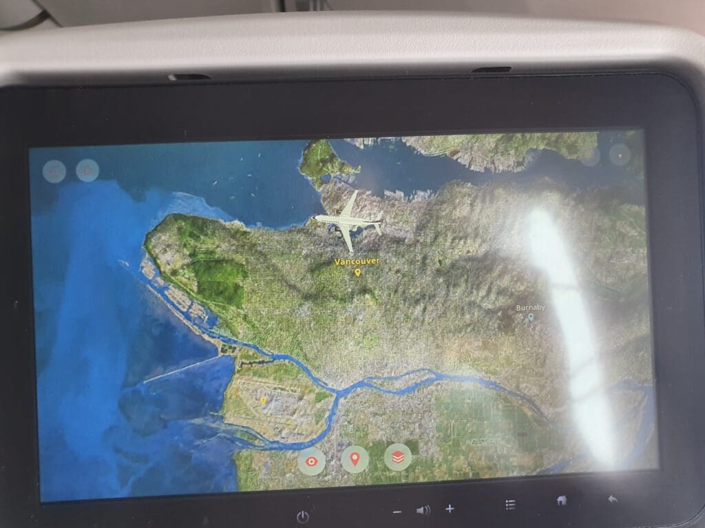 A minute or so after returning to my seat, the words ‘cabin crew, thirty minutes to landing’ rang out through the cabin which was followed by a longer announcement from the Cabin Director advising of the imminent commencement of our descent. A couple of minutes later, at 1449 Pacific Standard Time, around halfway between Kelowna and Vancouver, the Boeing could be felt leaving its cruising altitude of 36,000 feet. A short time later the seatbelt signs were reilluminated, just in time for around ten minutes of some fairly noticeable bumping and rattling during which the crew cautiously made their way through the cabin collecting rubbish and ensuring all was in place for our arrival. Whilst nothing could be seen for much of the descent, the aircraft headed over Harrison Lake and the mountain peaks that sit to the north of Vancouver before arriving at Coquitlam. From there, the aircraft crossed almost directly over Vancouver before heading over the Strait of Georgia and turning back towards Vancouver Airport.