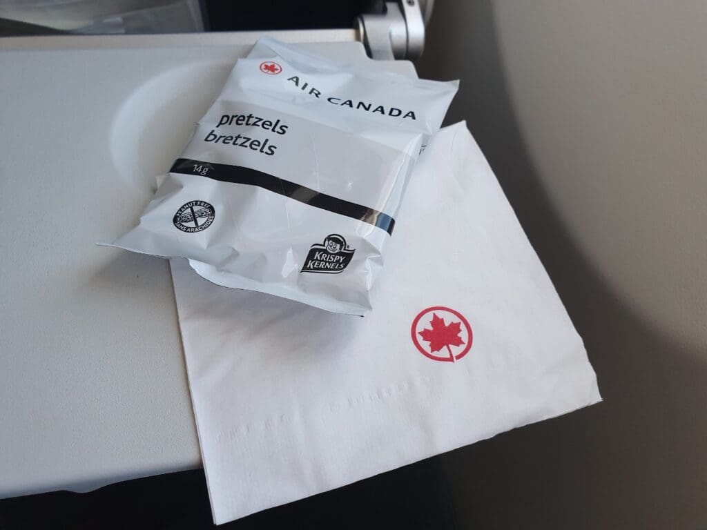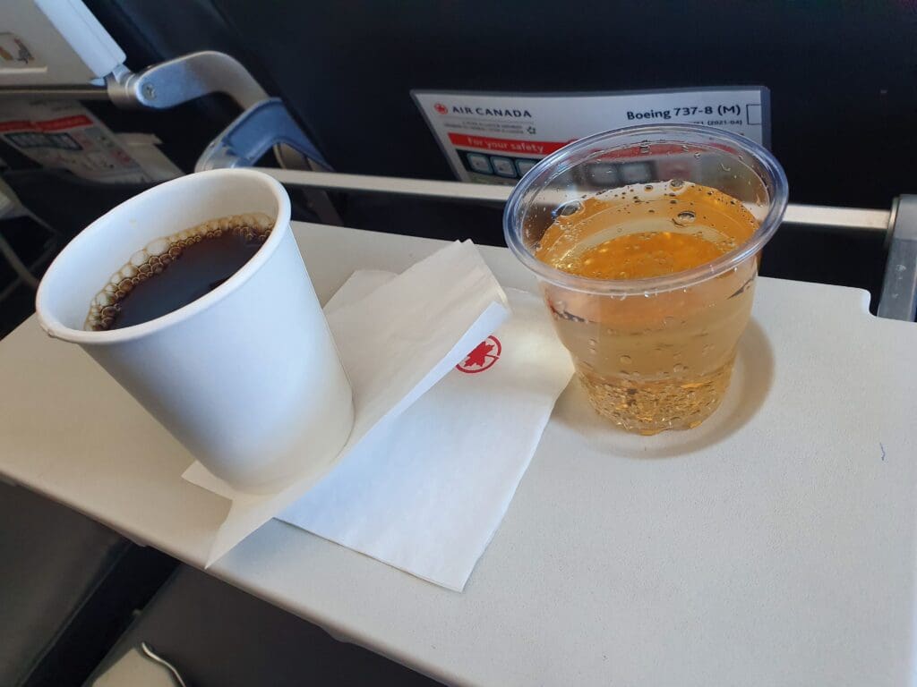 A short time after emerging from the clouds, the seatbelt signs were extinguished and a trolley was rolled out to the front of the cabin. A third flight attendant then appeared and distributed packets of Air Canada-branded Krispy Kernels salted pretzels, doing so without a word. Several minutes later, having made quick progress as they worked the cabin, the two flight attendants manning the drinks trolley arrived at my row and in a polite and friendly manner requested my choice of drink. Opting for a ginger ale and a black coffee, both were handed to me in what was perhaps the friendliest interaction I have experienced on all of the Air Canada services that I have taken thus far in my life. However, unlike on my previous Air Canada flights, the option of having a whole can was not offered – not that this was any major issue.