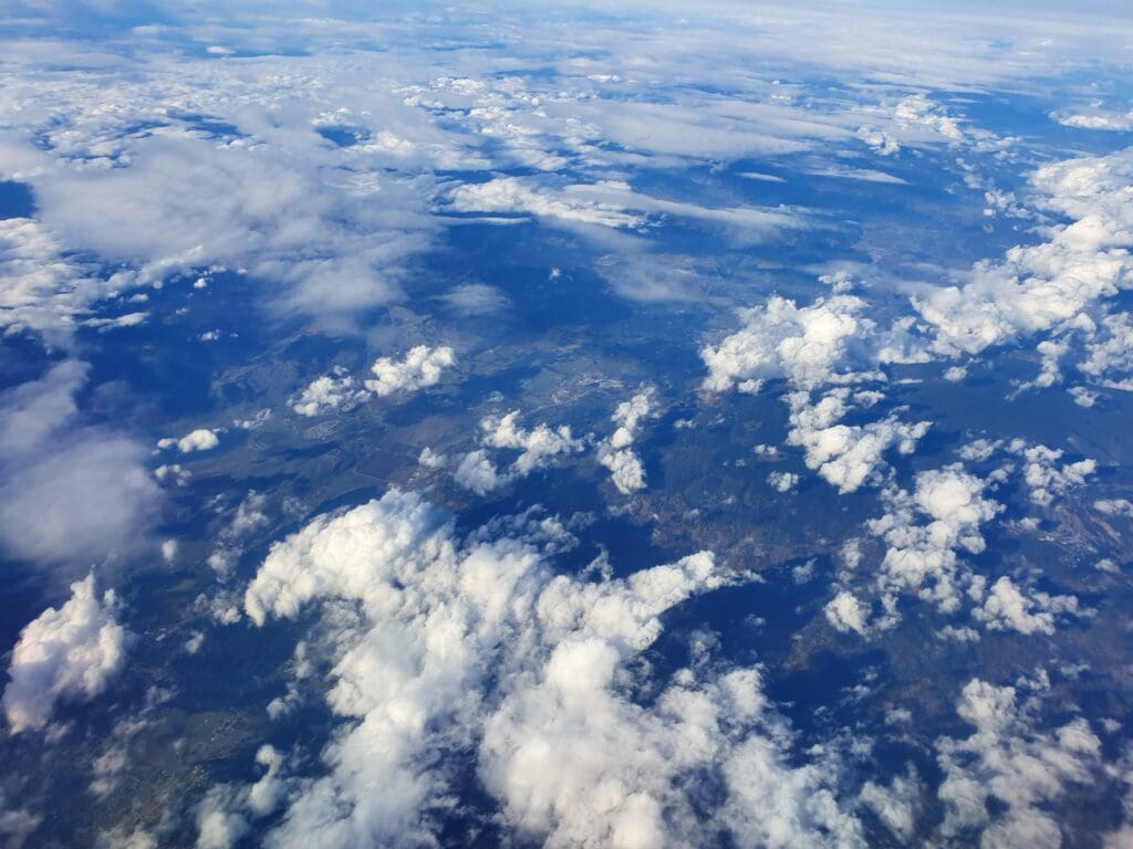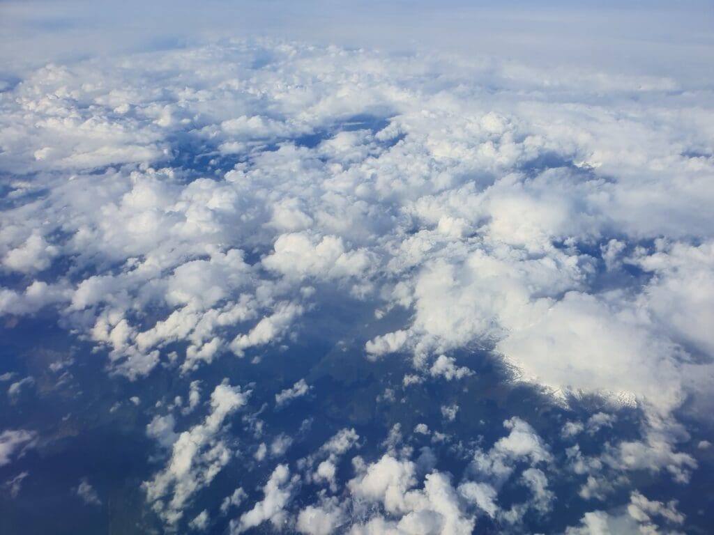 That afternoon, I had hoped that the flight would offer a superb view of the Rockies, however, it soon became evident that at least for the initial stages of the flight, this would not be the case. After several minutes of cutting through the clouds with the occasional bump, blue skies eventually appeared above the aircraft. As the Boeing climbed, another announcement was made in English only informing passengers of the buy-on-board service for alcohol and snacks, and advising passengers to keep their masks on and seatbelts fastened. Following this announcement, a flight attendant then passed through the cabin offering complimentary headphones and replacement face masks.
