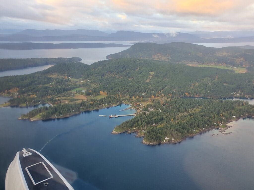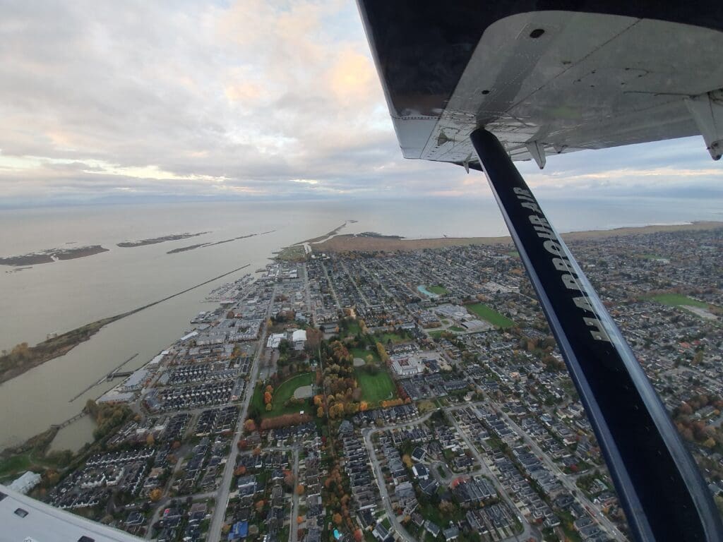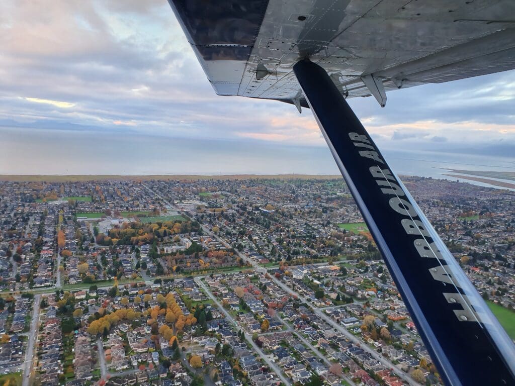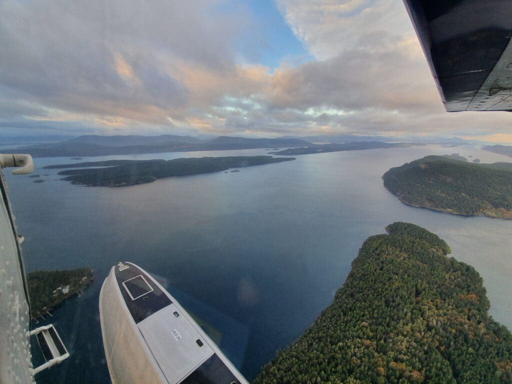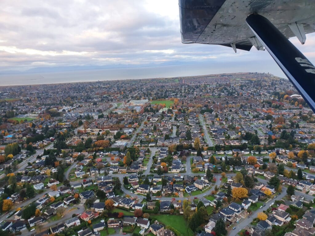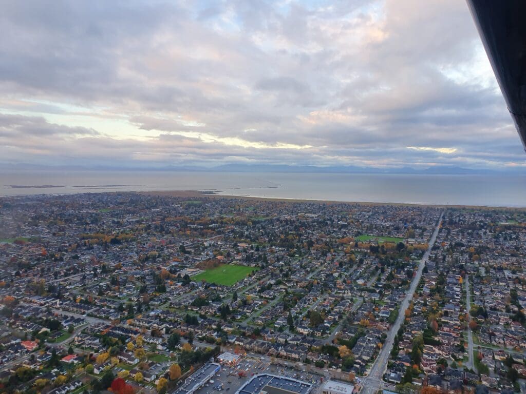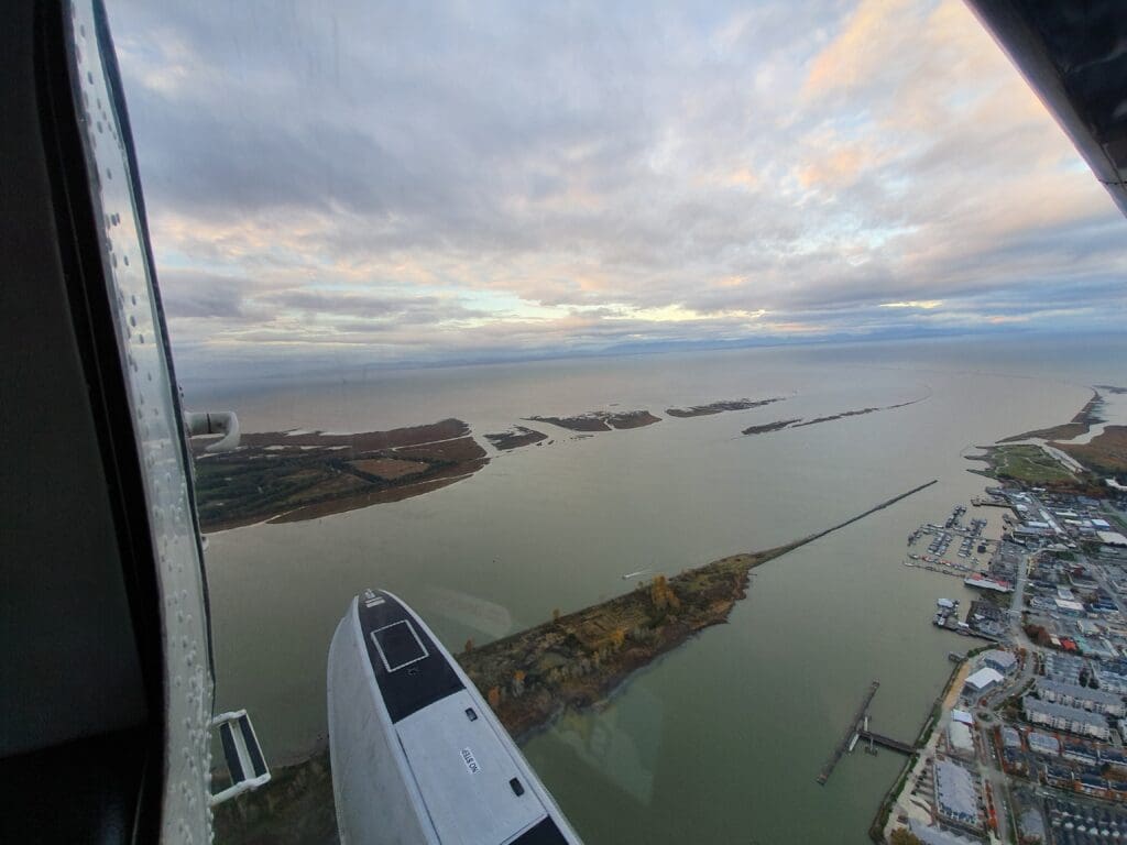 At 0816, the aircraft made its way onto the invisible water runway before the engine roared into life and the aircraft performed a surprisingly smooth and gentle takeoff roll along the water. Once in the skies, the aircraft skimmed just over the surface of the water for several seconds before pulling up and climbing over Richmond’s shoreline and passing over the Richmond Olympic Oval. Sitting on the right-hand side of the aircraft, during the first few minutes of the flight, I was offered views of the flat suburbs of Richmond as the aircraft cruised towards the coast. Heading south at 1,900 feet, three minutes after departure the aircraft passed over Steveston Harbour in southern Richmond and left the mainland behind, soon crossing Shady Island and Westham Island. Meanwhile, on the left-hand side of the aircraft, the Roberts Bank container port and Tsawwassen ferry terminal could be seen, along with the famous American territory of Point Roberts.