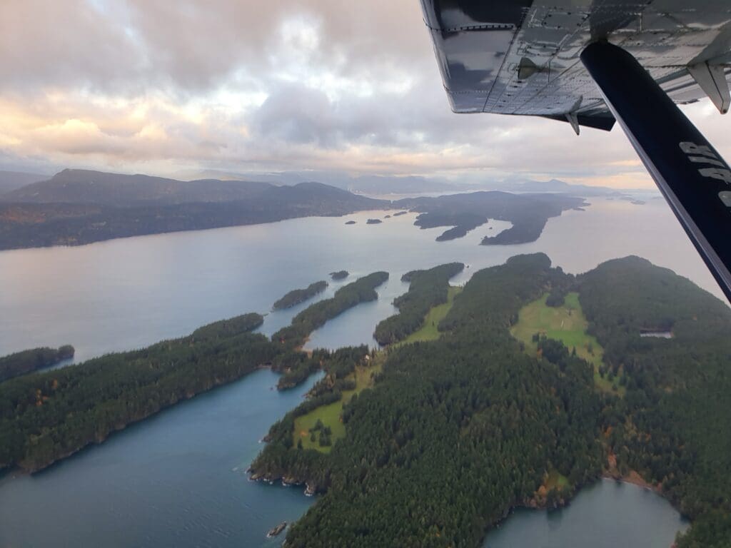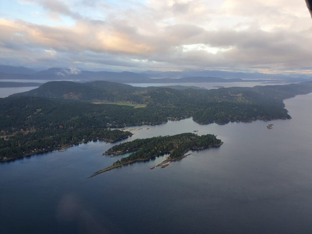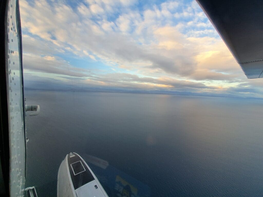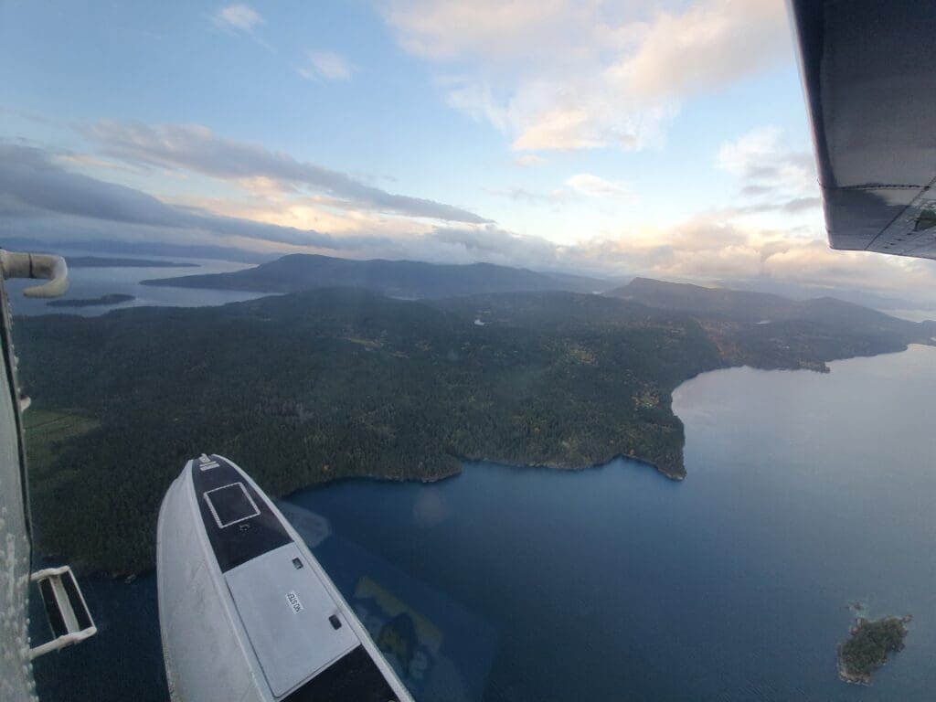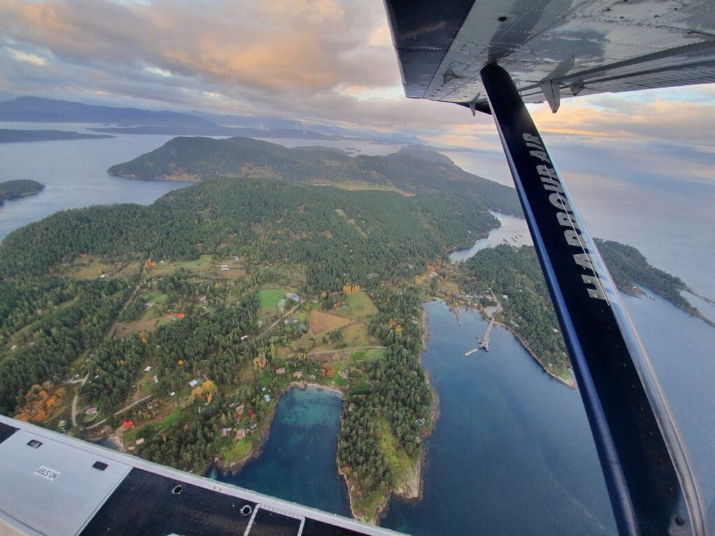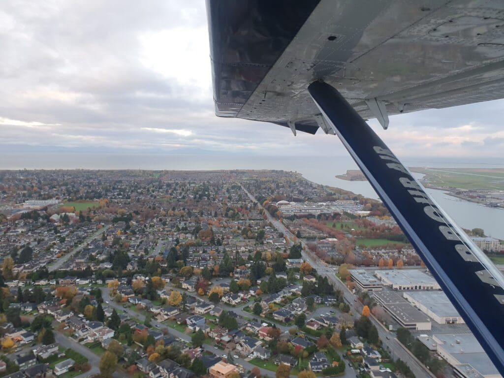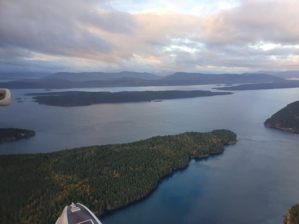 At 0816, the aircraft made its way onto the invisible water runway before the engine roared into life and the aircraft performed a surprisingly smooth and gentle takeoff roll along the water. Once in the skies, the aircraft skimmed just over the surface of the water for several seconds before pulling up and climbing over Richmond’s shoreline and passing over the Richmond Olympic Oval. Sitting on the right-hand side of the aircraft, during the first few minutes of the flight, I was offered views of the flat suburbs of Richmond as the aircraft cruised towards the coast. Heading south at 1,900 feet, three minutes after departure the aircraft passed over Steveston Harbour in southern Richmond and left the mainland behind, soon crossing Shady Island and Westham Island. Meanwhile, on the left-hand side of the aircraft, the Roberts Bank container port and Tsawwassen ferry terminal could be seen, along with the famous American territory of Point Roberts.