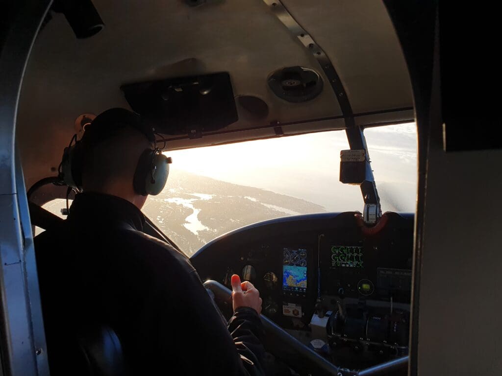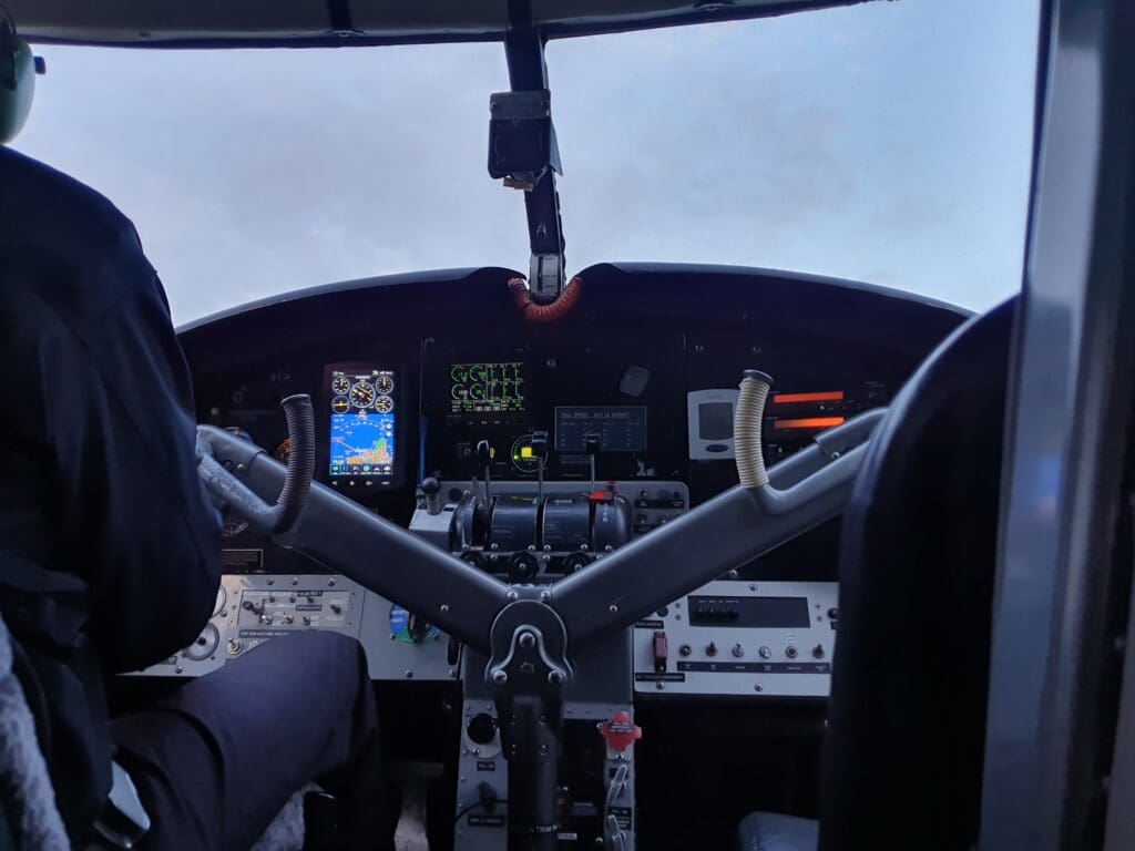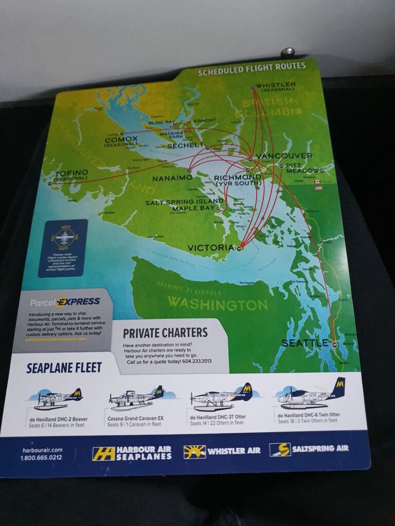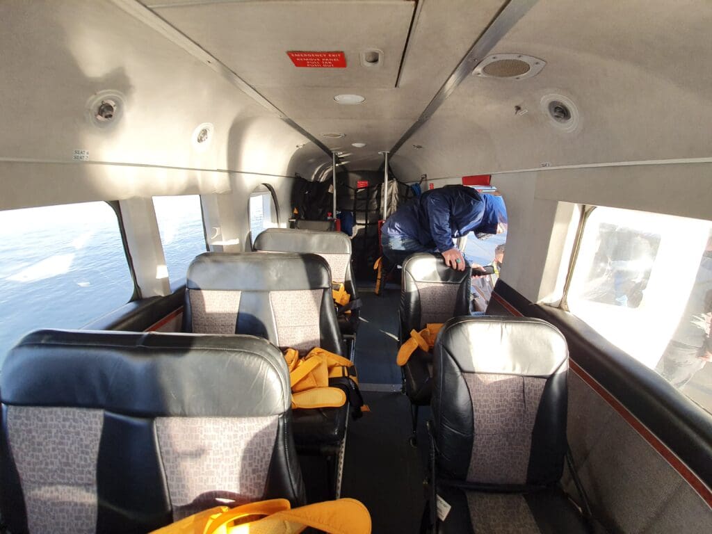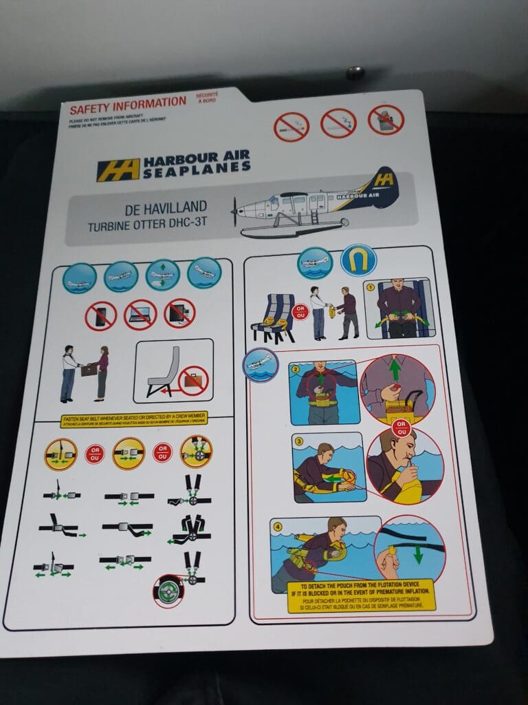Inside, the cabin is complete with fourteen small yet well-padded seats, each of which is covered in a part fabric, part leather covering. Upon boarding, wearable floatation devices could be found on each seat and we were later advised to strap these around our waists. Meanwhile, a safety card, sick bag and route map showing Harbour Air’s network of scheduled routes could be found in the seatback pockets, or the side pockets in the case of those seats in the forwardmost row. Despite the aircraft’s age, I was pleased to find this to be a clean and presentable state, with only minimal marks and scratches, whilst the large bulbous window to my right was clean and clear, allowing for great photographs in flight. Finally, it is worth noting that those favouring comfort over cockpit views may wish to avoid the front row seats, as these proved to be a tight squeeze.