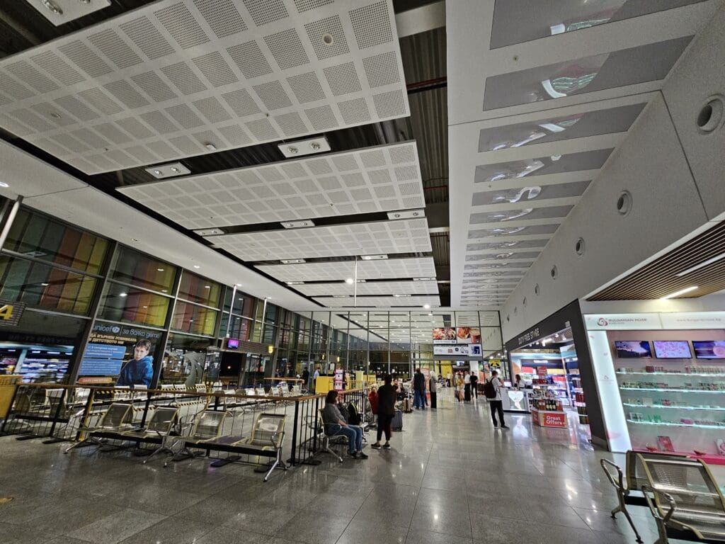 Importantly for enthusiasts, large glass windows offer a view of the ramp outside. However, as the terminal sits on ground floor level, various light poles and other objects mean that the view outside is partially obstructed and not ideal for more professional spotters looking to get decent photographs of the aircraft on the ramp.