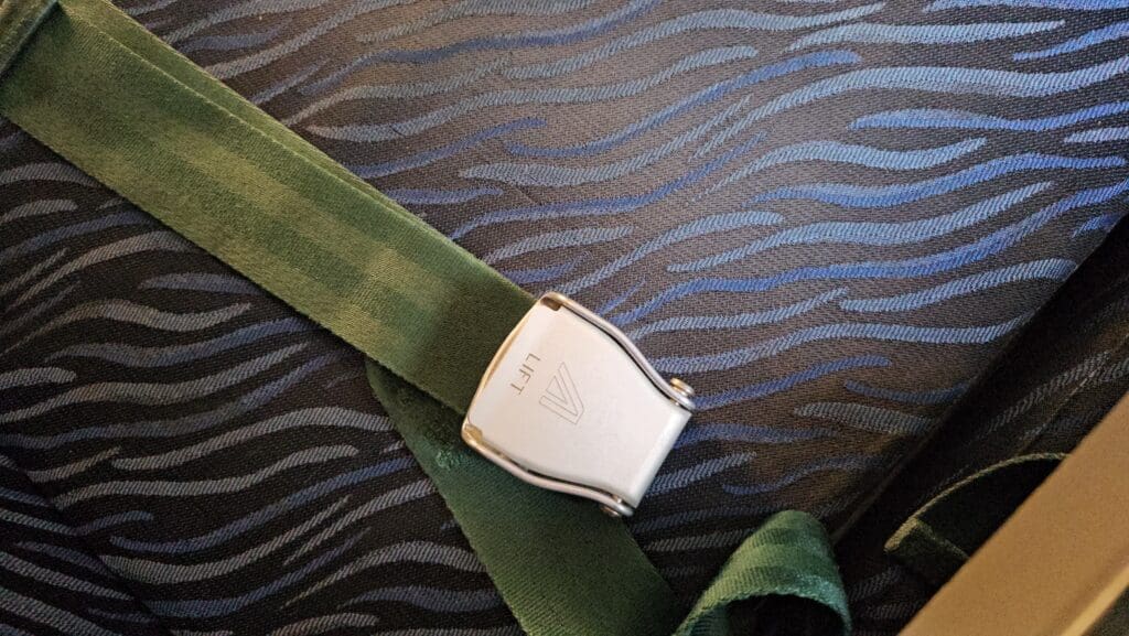 As with all European Air Charter MD-80s, only minimal changes had been made to the cabin since the aircraft stopped flying with Alitalia. Throughout the cabin, Italian signage could easily be spotted along with green tray tables and seatbelt straps. However, the most obvious sign of the aircraft’s former operator was the Alitalia motif engrained into each seatbelt buckle. However, fans of the defunct Italian carrier may be somewhat disappointed to hear that the green fabric that once covered the aircraft’s seats has since been replaced by a zebra-like blue-dark blue pattern, whilst these were topped with a disposable fabric antimacassar that sports European Air Charter’s logo.