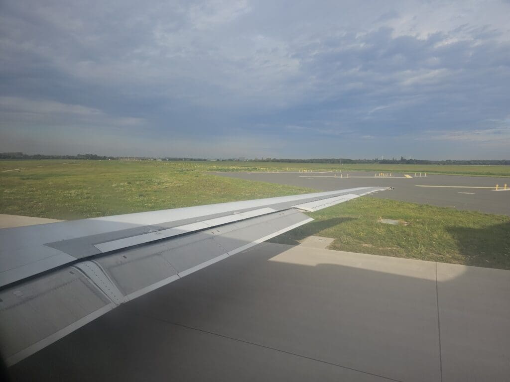 With Dresden soon disappearing, the aircraft continued onwards over the mostly rural landscapes of Saxony where little could be seen other than the odd industrial estate and small town. Indicating that we were soon to land, the flaps were lowered in preparation for our arrival, followed by the landing gear which fell into position with a loud clunk as we crossed over the blue waters of Schladitzer See. Whilst those on the opposite side of the aircraft would have been treated to views of Leipzig, facing north no such views could be had, although as an aviation enthusiast, I had few complaints about having to look at the front end of the starboard JT8D engine As we approached the airport, the MD-82’s flaps were fully extended and as I had noticed on my Meridiana MD-80 ride, during the final stages of the flight, the engines seemed to produce plenty of noise as if the throttles were being constantly pushed and pulled.