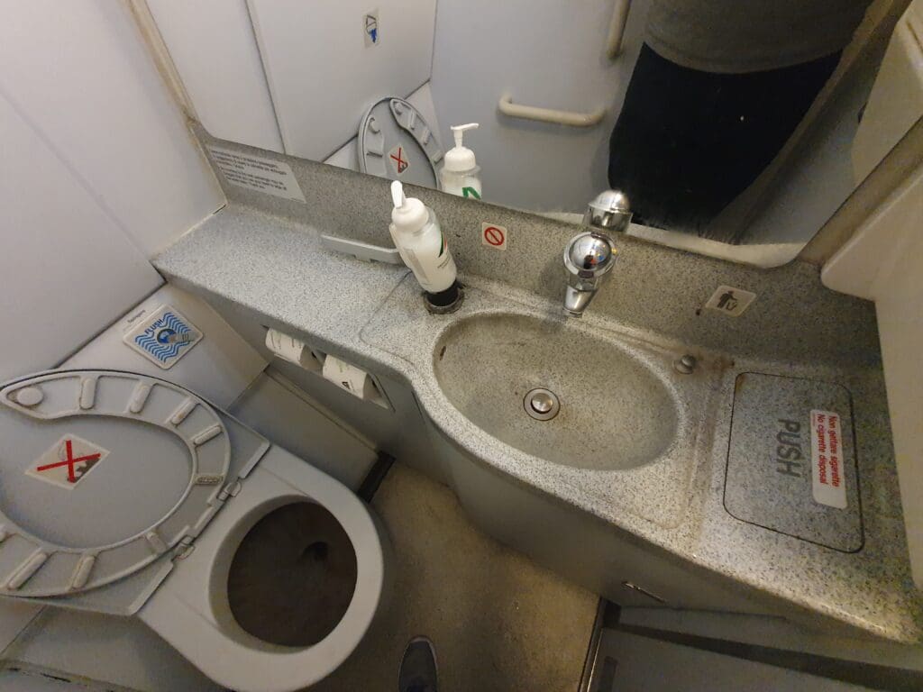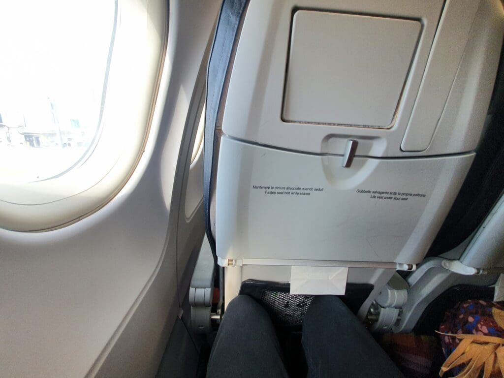 By the time I reached Row 25, I noticed that my neighbour was already sitting in the middle seat, and thus, not wishing to disturb them during the flight, I plonked my bag down and made a quick trip to one of the two lavatories at the rear of the aircraft. Upon opening the door to this, I found this to be in a seemingly dirty condition with plenty of signs of wear and tear. Nevertheless, this served its purpose and featured all the things that you would expect to find in an aircraft lavatory. Hoping that my seat would not be in such a poor state, I made my way back into the cabin and soon settled down in Seat 25A. Unfortunately, upon sitting down I was disappointed to see that this was absolutely covered in marks and scratches, having seen better days. Meanwhile, the plastic armrest cover of the seat in front of mine appeared to have become detached. Were the seat to have proven comfortable, this would have gone a little way to redeem ITA Airways however unfortunately, despite the seat’s chunky appearance, this was not the case. This featured a dire amount of legroom that seemed to be worse than the carrier’s low-cost rivals and thus the seat felt cramped and uncomfortable for the duration of the flight. Furthermore, I managed to spot a fair number of crumbs around this indicating that the cabin had not been properly cleaned during its short turnaround in Rome.