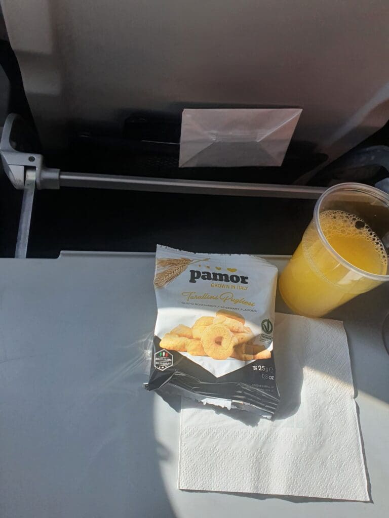 From Rome Fiumicino, the Airbus continued on the runway heading and flew westwards out over the Mediterranean for a few minutes before gently banking onto a northwesterly heading and flying very roughly parallel with Italy’s western coastline. Around twenty minutes after taking to the skies, and with almost no bumps whatsoever, the aircraft levelled off at its cruising altitude of 36,000 feet. Despite smooth flying conditions that evening which lasted to London, the seatbelt signs remained illuminated for the duration of the journey however, the cabin crew did nothing to reprimand those passengers who stood up whilst in the cruise. A short time after levelling off, the two flight attendants tasked with looking after those seated in Economy rolled a trolley to the front of the cabin and commenced the inflight service. Reaching my row around twenty minutes later, I was offered a sweet or savoury snack and settled on the latter. After a bag of what turned out to be a delicious Italian baked snack, Taralli Pugliese was handed over to me along with a serviette featuring Alitalia’s motif, I was offered a choice of drink. Opting for an orange juice, this was poured into a plastic cup and cautiously passed across to me, over the heads of the two neighbouring passengers. Given the length of the flight, this service left me with nothing to complain about and served to beat that of many other ‘full-service’ European carriers.