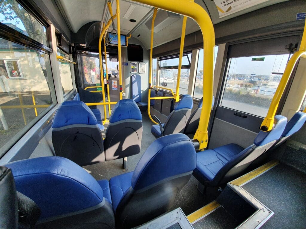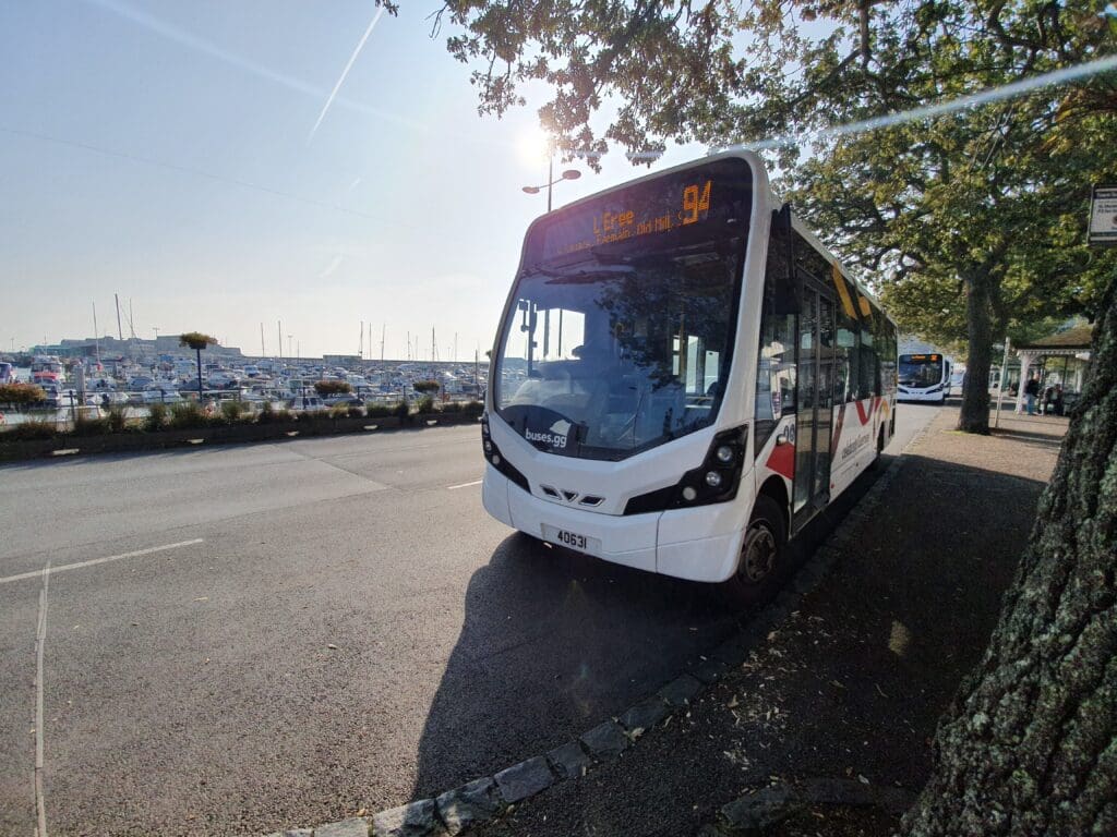 Having heaps of time before my afternoon flight to London, and given the glorious early autumn weather, I was in no rush and spent an hour leisurely exploring the quiet streets and harbour before making my way to the town’s main bus stop. Once there, a modern bus bound for L’Erée via the airport could be seen waiting for its next load of passengers. Being the first to board, I was given a friendly welcome by the driver and paid the impressively cheap £1 fare by contactless card. After two fellow passengers boarded, the bus door closed and we trundled up the hill away from the harbour. With no passengers wanting to embark or disembark during the route’s first few stops, the bus managed to make the entire journey along the island’s narrow streets to the airport without stopping at any stops.