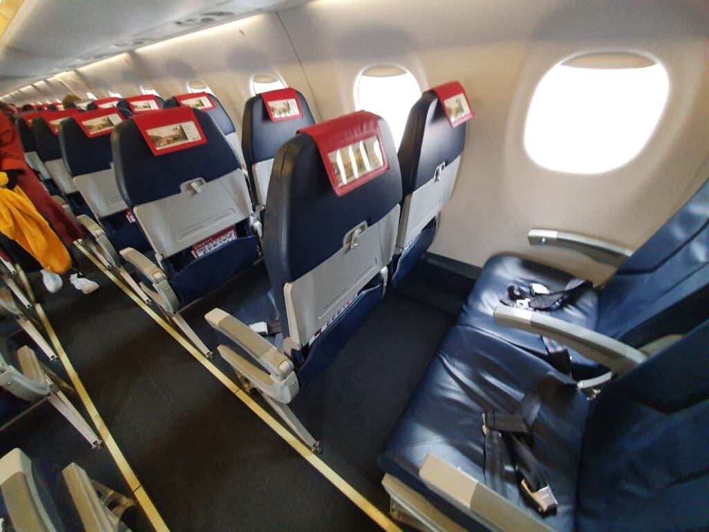 By the time I had sat down, boarding was nearing its completion, with the very last passengers making their way onto the aircraft at 1433. That afternoon, the flight was approximately 75% full with most taking the form of solo passengers, and most, including myself, were able to enjoy the luxury of having no neighbour. At this time, an announcement was made requesting passengers to keep their masks on throughout the flight and advising all not to wipe down any surfaces as this may limit the effectiveness of the hospital-grade cleaner used to disinfect the cabin between flights. This was then followed by a speedy announcement from the Captain who advised that the flight up to Gatwick would take 33 minutes and gave a brief overview of the route and weather during the flight. Almost without a pause, the next in the series of announcements was performed – this consisting of a welcome from the Purser with all the usual content such as a welcome and a brief safety message regarding seatbelts before the crew took their positions in the aisles in preparation for the safety demonstration. This was conducted to a pre-recorded safety announcement.