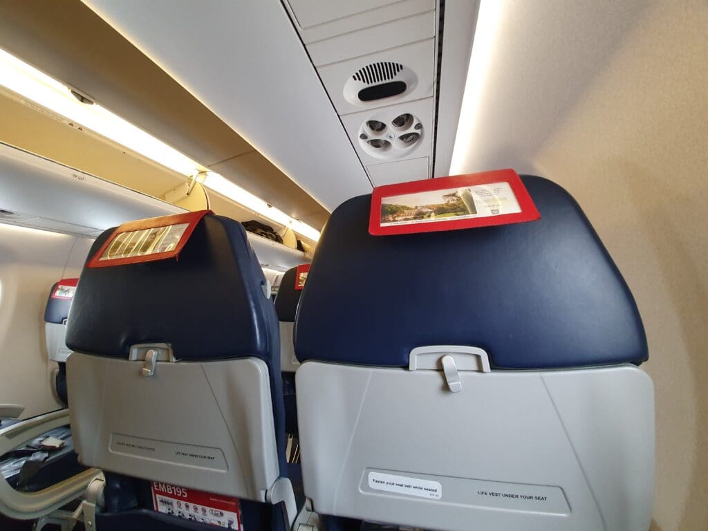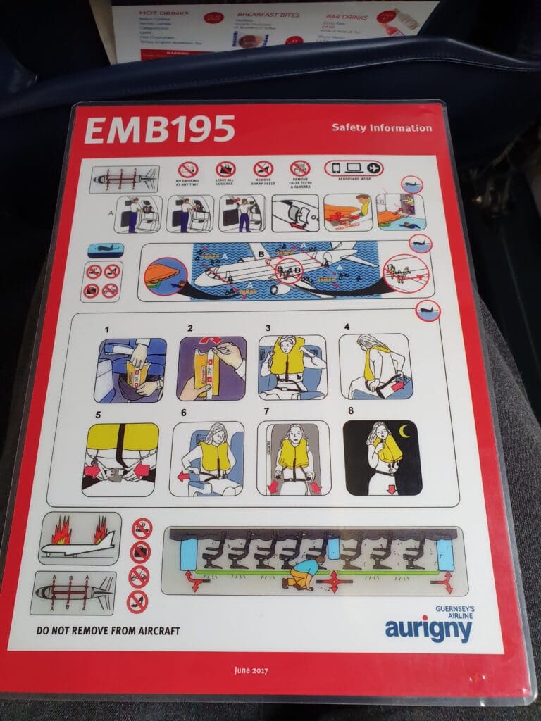 After skirting around the wingtip and taking several photos, I joined a fast-moving queue on the airstairs before soon stepping into the rear galley. As soon as I stepped foot on the aircraft, I was given a friendly welcome by two members of the four-strong team of cabin crew. With nowhere to go other than left, I turned into the cabin and trundled down the aisle towards the centre of the aircraft. Onboard Aurigny’s sole Embraer, each seat is covered in dark blue (faux?) leather and is topped with either a red or blue (faux?) leather antimacassar. On the rear of these, a small advertisement for Sark’s Stocks Hotel could be seen. Upon arriving at Row 20, I took my seat, strapped myself in and settled down for the short journey to the mainland. As was to be expected given the apparent thinness of the seat, this was rather firm although the legroom was surprisingly fantastic for a regional jet. As one would hope, the aircraft appeared to be spotlessly clean and in good condition with only a few very minor marks and scratches dotted about. Turning to the seatback pocket, this contained a safety card, a copy of the SkySnacks buy-on-board menu and duty-free catalogue, as well as a logoless white sickbag. As with many airlines, Aurigny has suspended their inflight magazine, En-Voyage due to the pandemic.