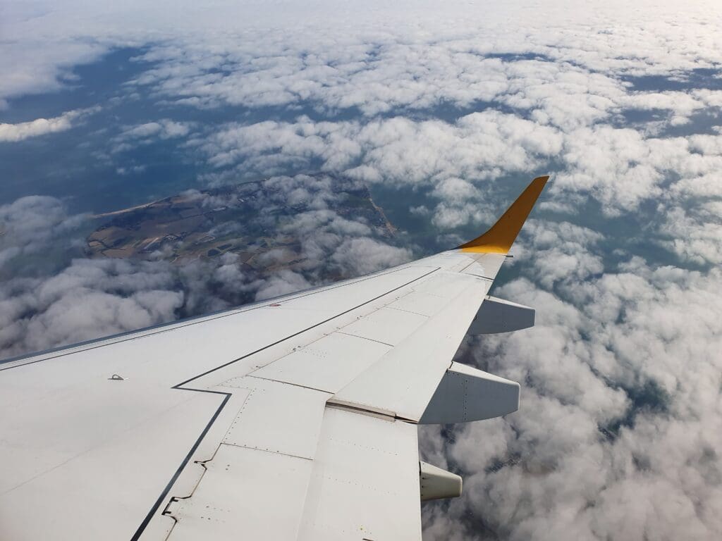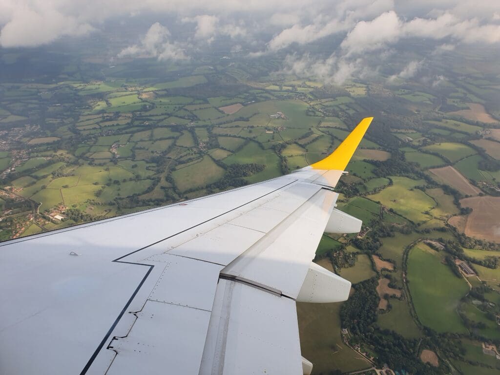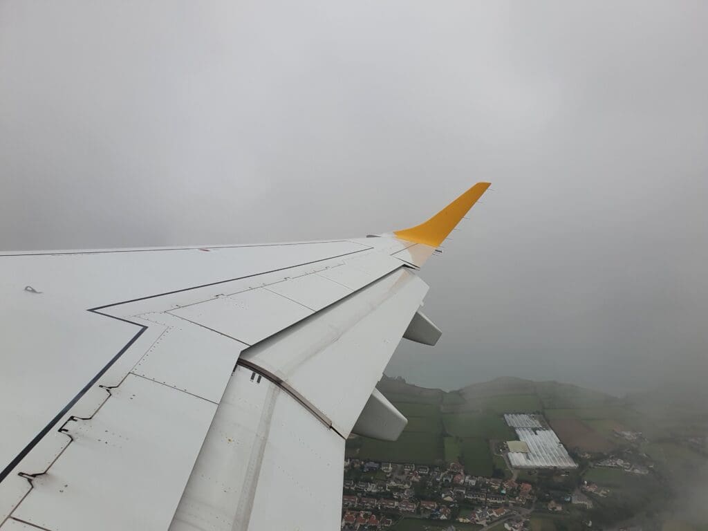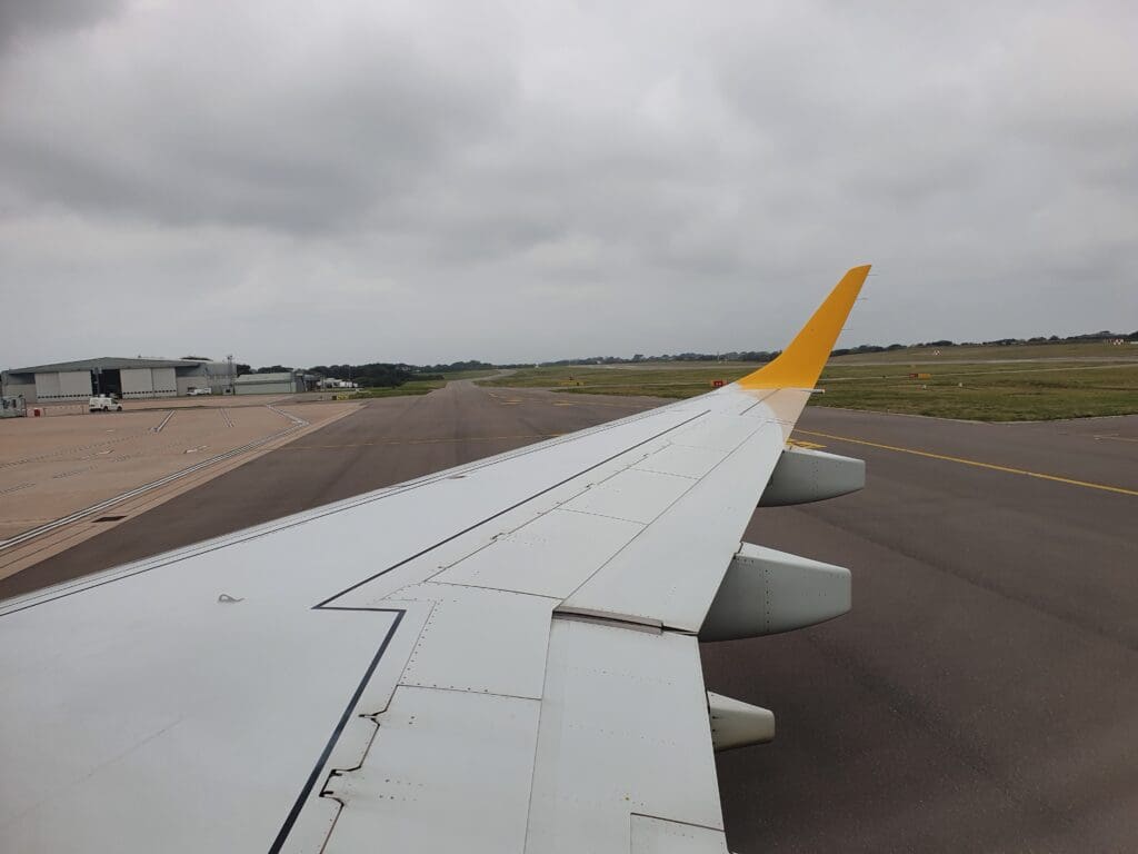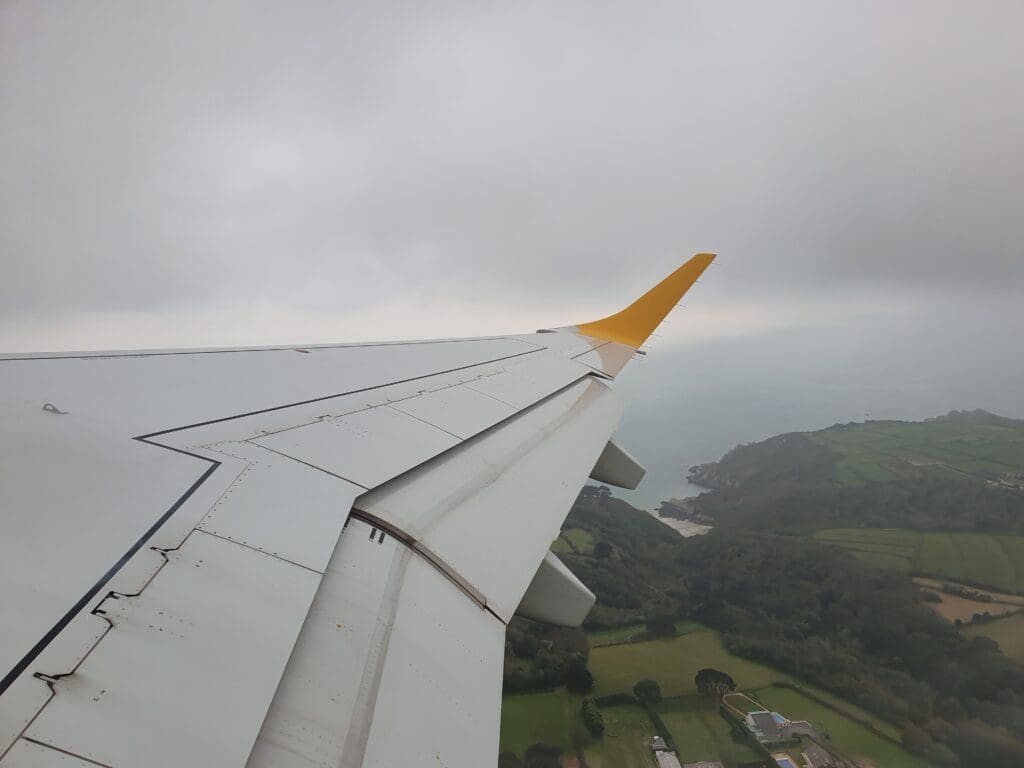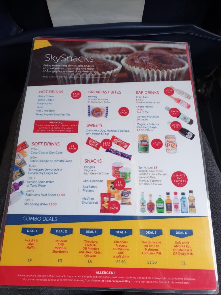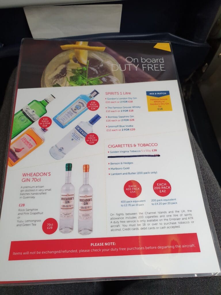 By the time I returned to my seat, the buy-on-board service commenced although few passengers opted to make a purchase and the crew were able to sail through the cabin relatively rapidly. Given their network of mostly very short flights, compared to other airlines Aurigny’s menu is somewhat limited although it does feature all the usual light sweet and savoury, hot and cold, alcoholic and non-alcoholic drinks, all of which came at the usual inflated inflight prices.
