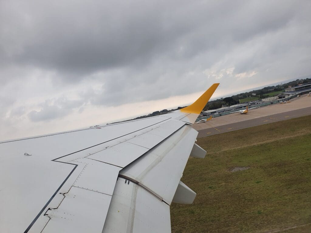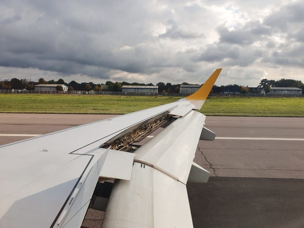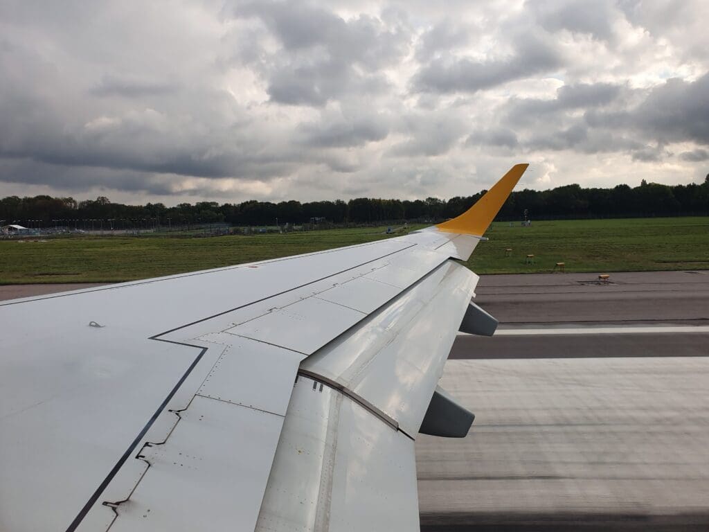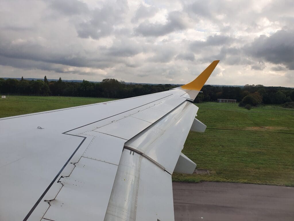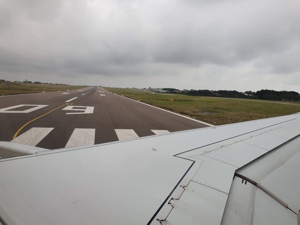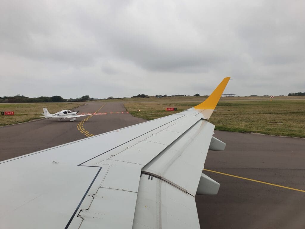 At the scheduled departure time of 1440, the Embraer 195 was pushed back away from the stand and its two General Electric CF34-10E5A1 engines quietly powered up into life below with several puffs of white smoke. Four minutes later, the aircraft then commenced its journey towards the end of Runway 09. Whilst those on the left-hand side of the aircraft were gifted with views of the general aviation apron, sitting on the right-hand side, all I could see during this was the runway, the airport’s northern perimeter and a Cirrus SR20 holding before its flight back to the UK.