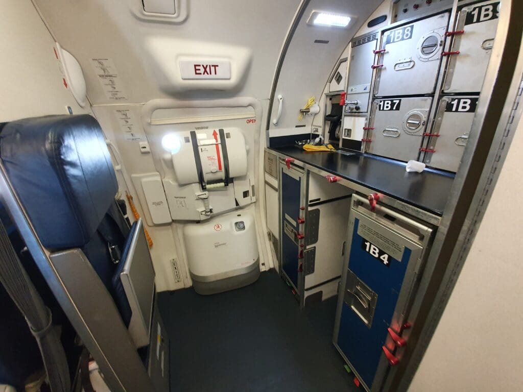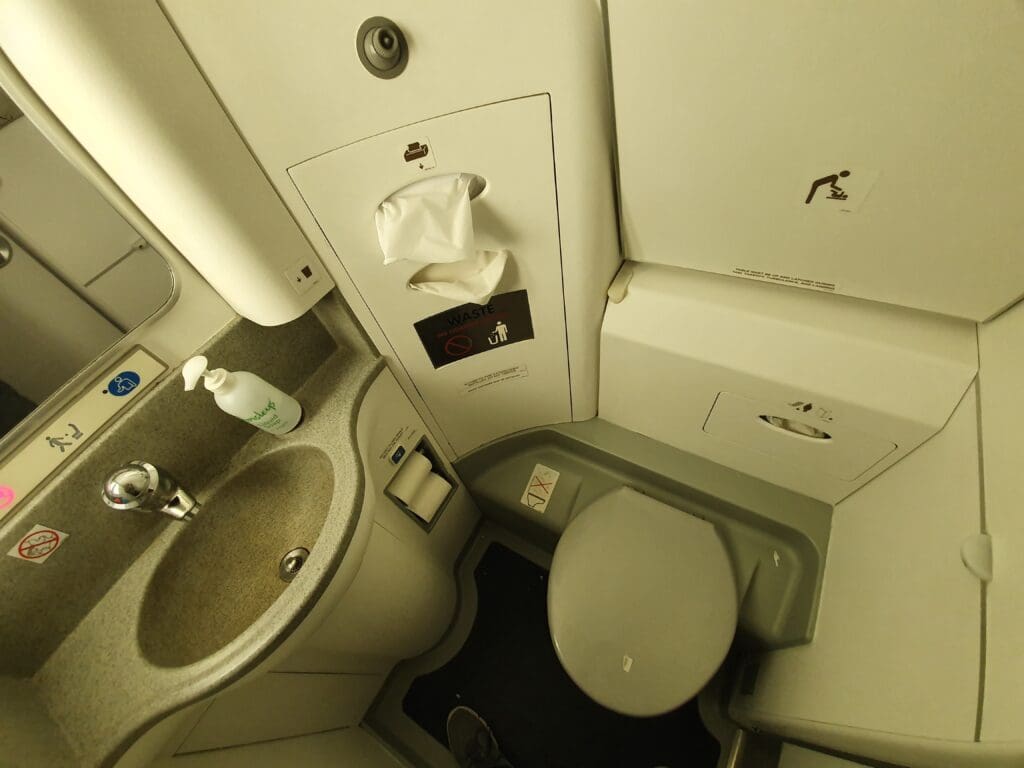 As the aircraft climbed through 10,000 feet just to the southwest of Alderney, the seatbelt signs were switched off were extinguished as I would otherwise not get the opportunity to do so, I decided to pay a visit to the onboard facilities. Located in the corner of the rear galley, this was unsurprisingly compact, however, this was clean and well-stocked with everything one would expect to find in an aircraft lavatory. Furthermore, it did appear to be in a relatively good condition with few marks or scratches, although this was perhaps to be expected given the short hops the aircraft undertakes between London and Guernsey, and its presumably infrequent usage.