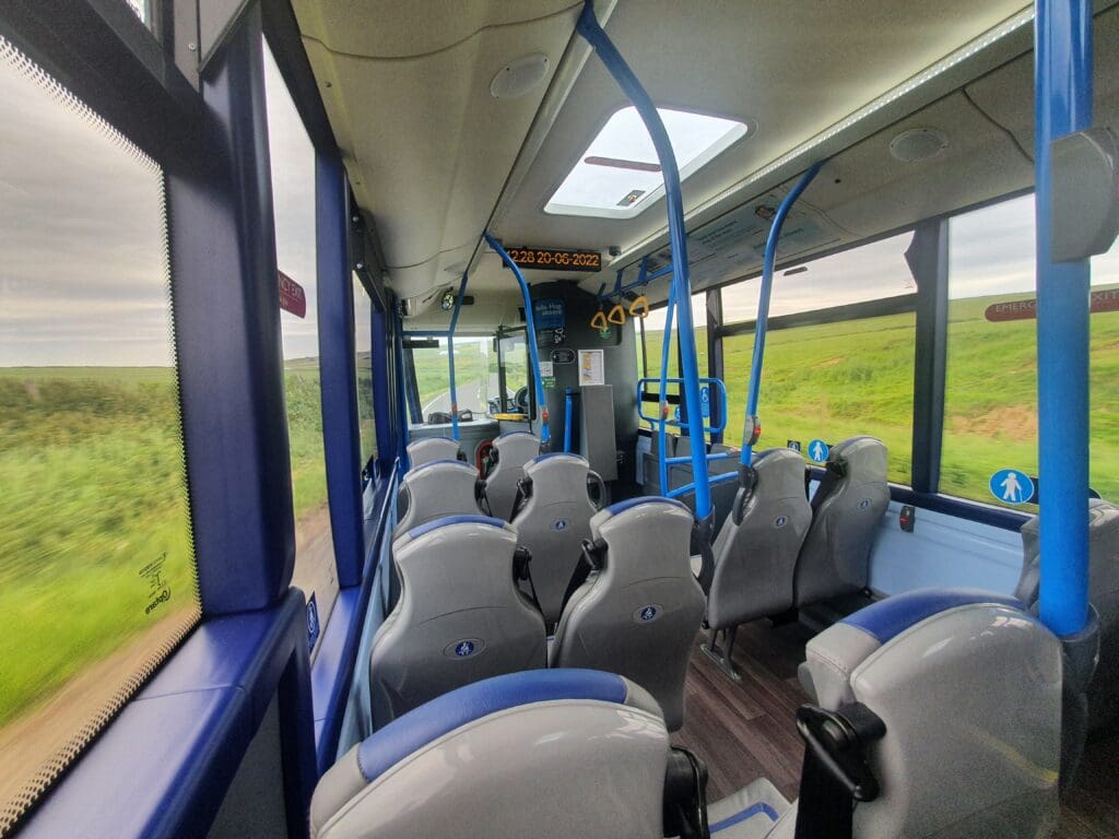 Despite being a keen walker, that afternoon the chilly Orcadian temperatures and lack of pavements on the road to the airport dissuaded me from making the one-hour walk to the airport. Fortunately, for much of the day, Kirkwall Airport is served by a relatively frequent bus service. This runs between the town centre and the airport, at its most frequent departing at intervals of every thirty minutes. After warming up for a few minutes in the waiting room, I headed outside to Stance 4 where a modern Stagecoach-operated bus could be seen waiting to head off. Upon stepping onto this, the driver gave me a friendly greeting before I paid the £1.70 fare by contactless bank card and headed down the bus. After sitting down, the driver popped out for a quick cigarette which, keeping the bus doors open, resulted in the scent of cigarette smoke lingering inside the small bus for the duration of the journey. Once they had returned to their cab, I was joined by one fellow passenger before this pulled out of the stand and headed down the town centre’s streets and out to Kirkwall’s suburbs. Following a quick mid-journey stop to allow the other passenger to disembark, the bus sped out of Kirkwall and soon enough the cold-looking waters of Inganess Bay appeared, next to which Kirkwall Airport could be seen. As we neared the airport, I caught sight of the Islander that I had taken the previous day sitting next to the Loganair hangar, as well two other Loganair aircraft sitting outside the terminal – an ATR 72 Freighter and a Saab 340, both of which would later head southwards to Inverness.