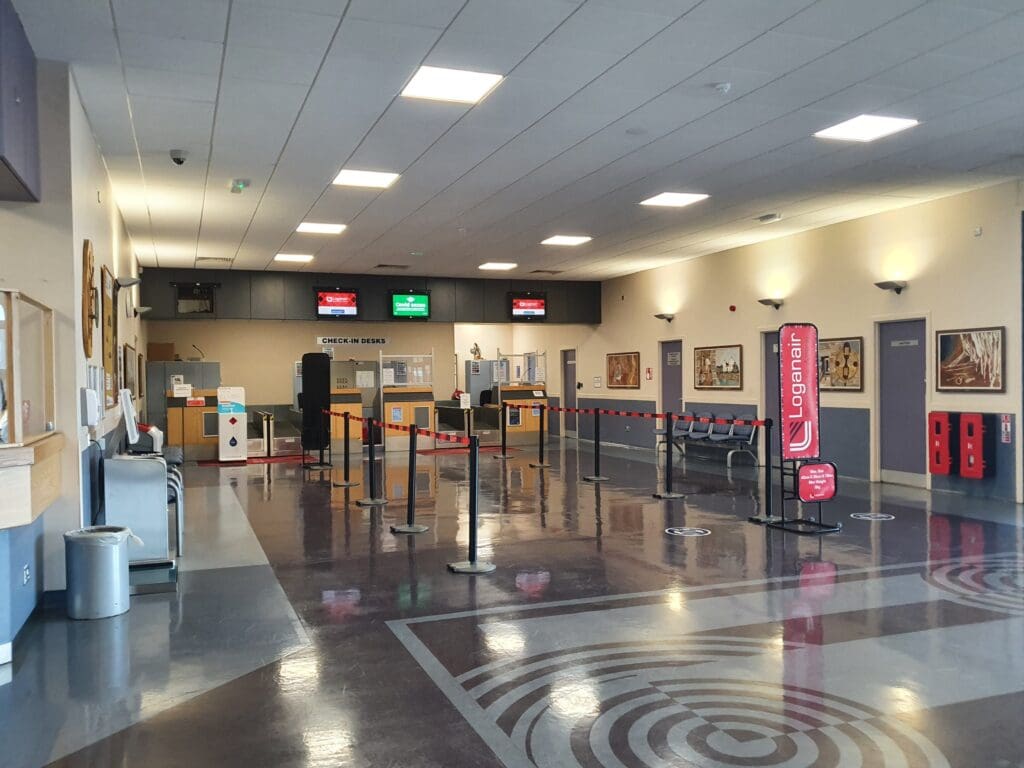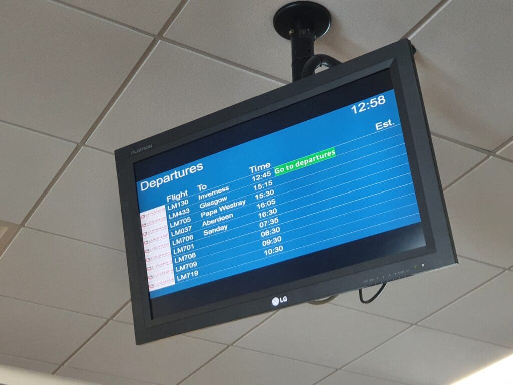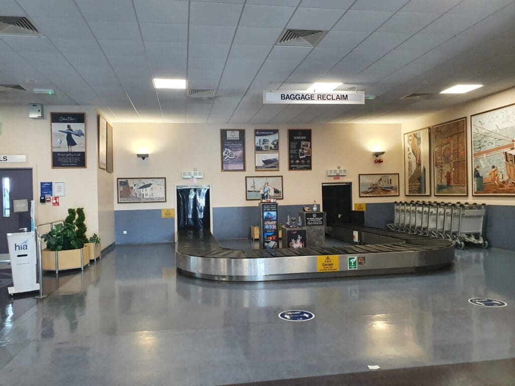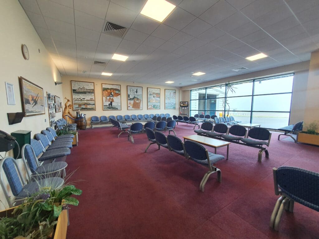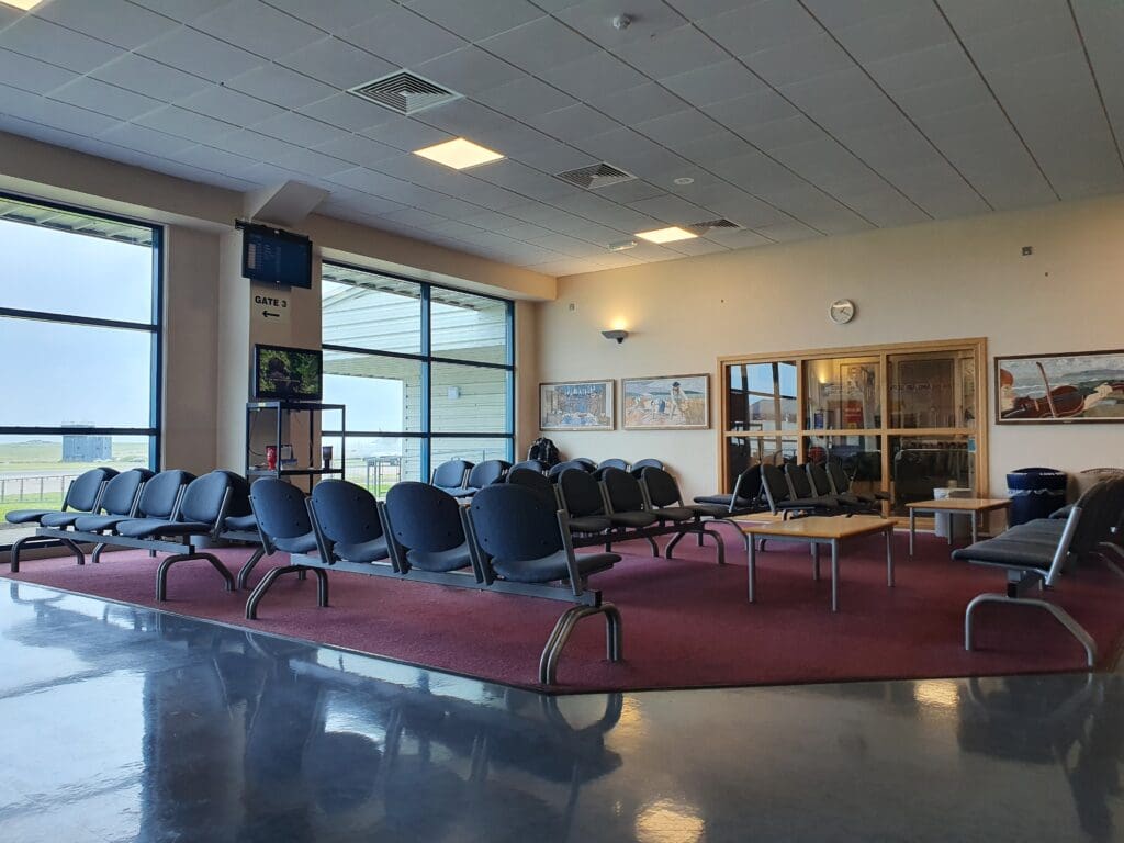 Once the aircraft came to a halt, many passengers stood up, perhaps in a rush to complete their journeys and fortunately for them, with no air stairs or ramp to be connected to the aircraft, disembarkation soon commenced. Seated at the rear of the aircraft and in no rush to exit the Saab, I waited for a while to allow those ahead to disembark before standing up and trundling through the mostly empty cabin. As I neared the front of the cabin, the flight attendant eagerly thanked me and wished me a nice evening, returning the thanks, I then cautiously made my way down the Saab 340’s built-in steps and headed onto the apron. Whilst the 19-degree temperature was far from tropical, after two days spent in the frigid Orkey air, this was a pleasant welcome back to the mainland. After snapping a couple of photos, I walked the short distance into the terminal and passed through the gate area where a cluster of passengers could be seen waiting to head off on the Saab’s next mission, a short hop across to Islay. With my flight to London City scheduled to head off at 1855 and not needing to collect any luggage, I had no reason to head to the landside area and so I stayed in the airside area.