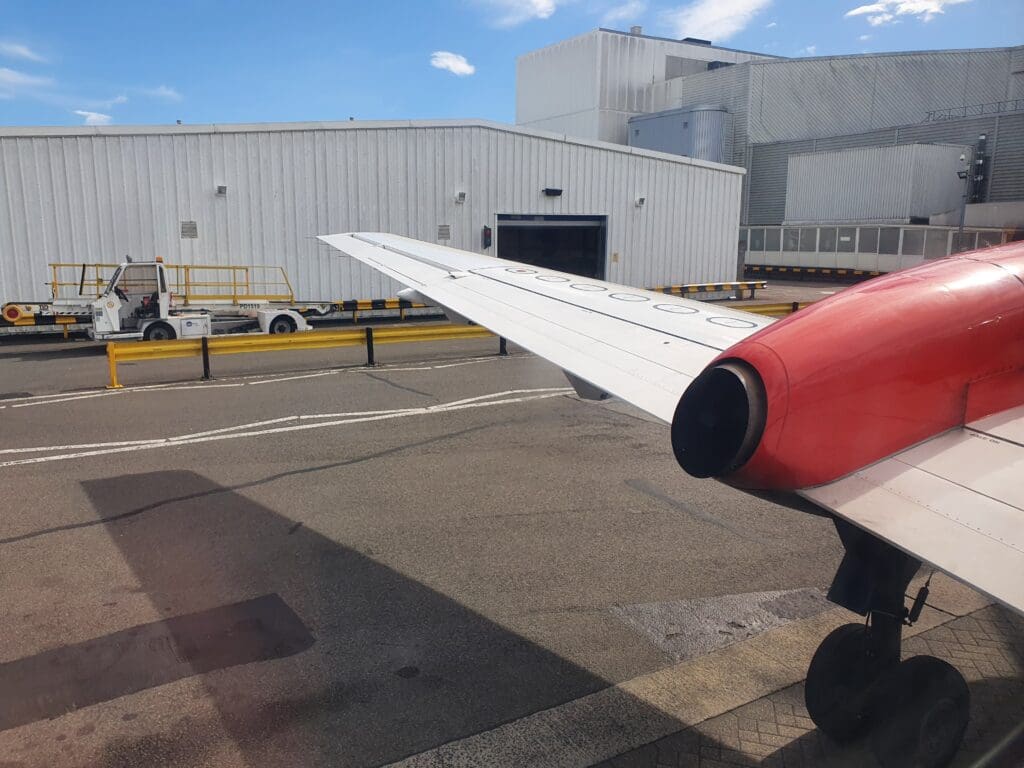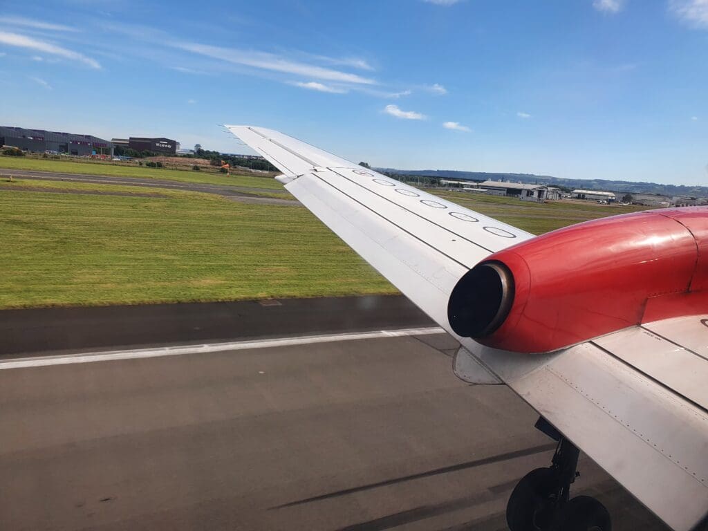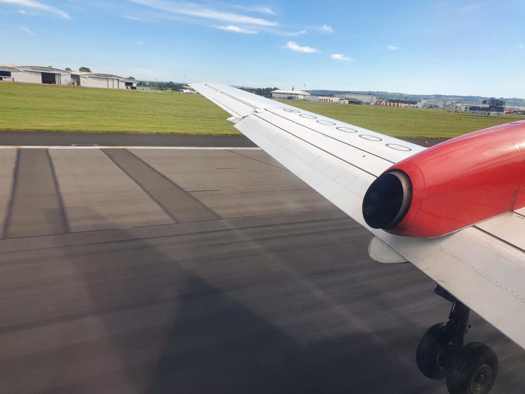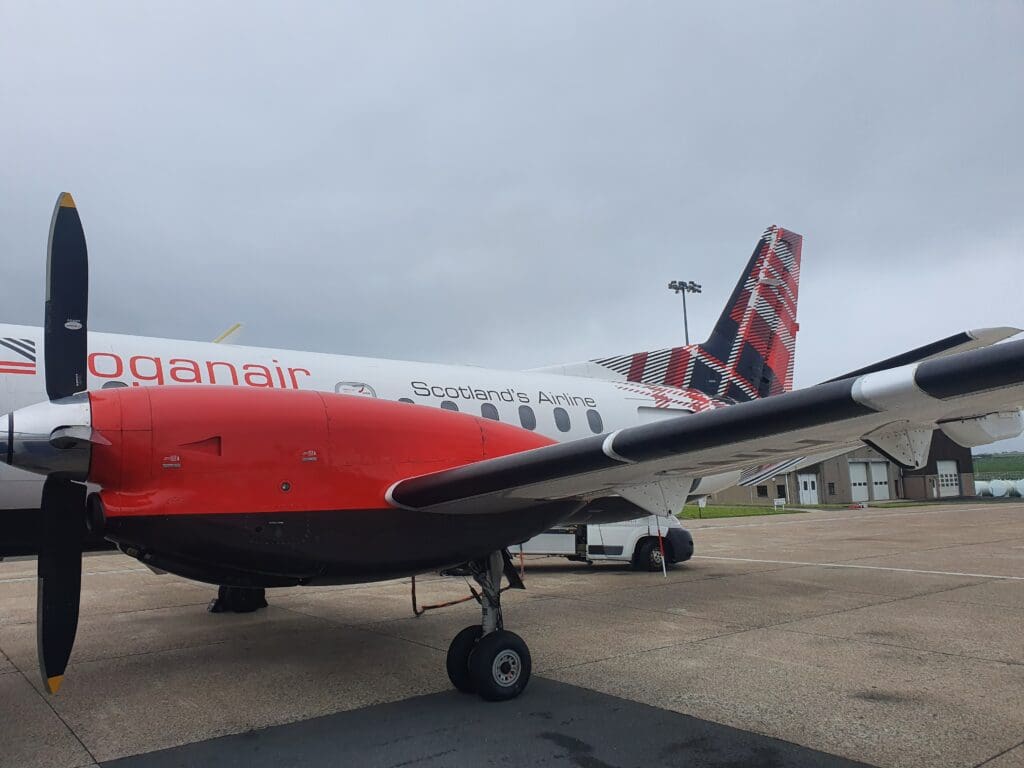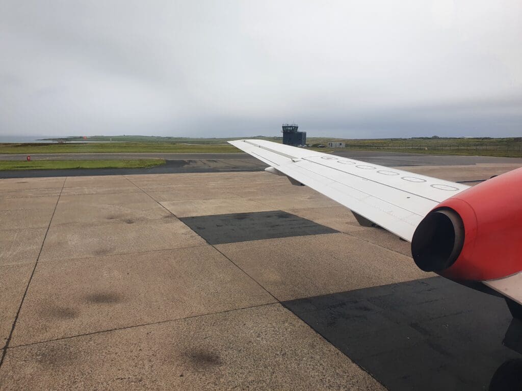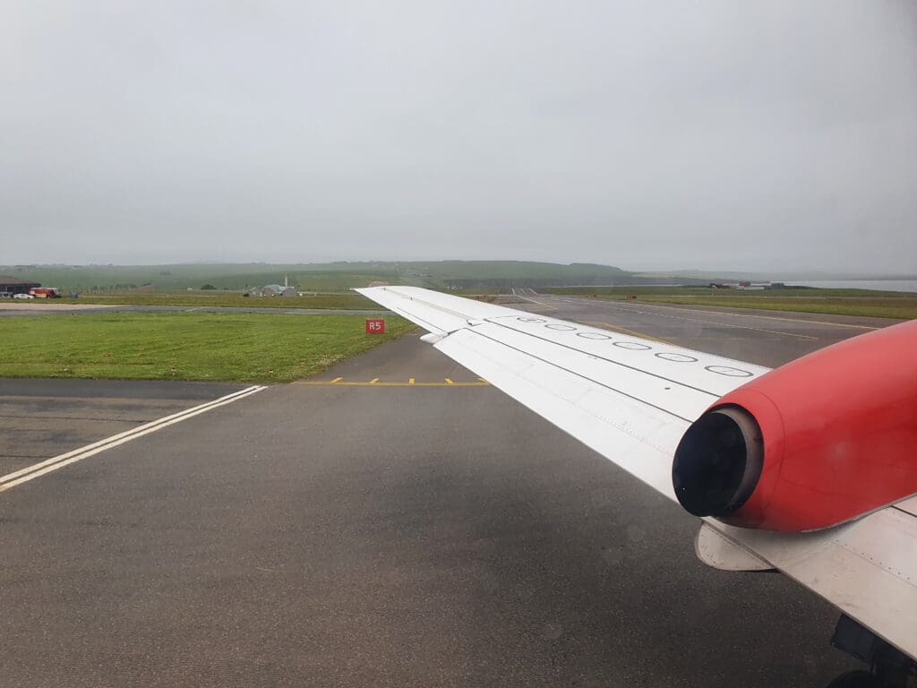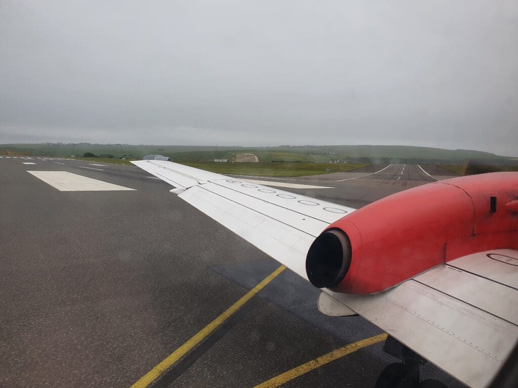 A grand total of 54 minutes after we had rocketed upwards into the cloudy Orcadian skies, at 1629 the Saab made a barely noticeable touchdown on Glasgow Airport’s Runway 23 – our gentle return to earth being slightly surprising given the fairly significant turbulence on approach. Once on the runway, likely seeking to minimise taxi time and with a TUI Boeing 737 MAX following a relatively short distance behind, the pilots braked rather harshly and the Saab soon slowed to a taxi speed. Sitting on the left-hand side of the aircraft, as the aircraft decelerated I was offered a view of the airport’s general aviation area where an American registered Cessna 425 and a TBM-940 could be seen, both resting having recently been ferried across the Atlantic. Other than this, two King Airs – one locally based and operating air ambulance services by Gama Aviation, and another based at Barrow-in-Furness and operating staff shuttles for BAE Systems could be seen.