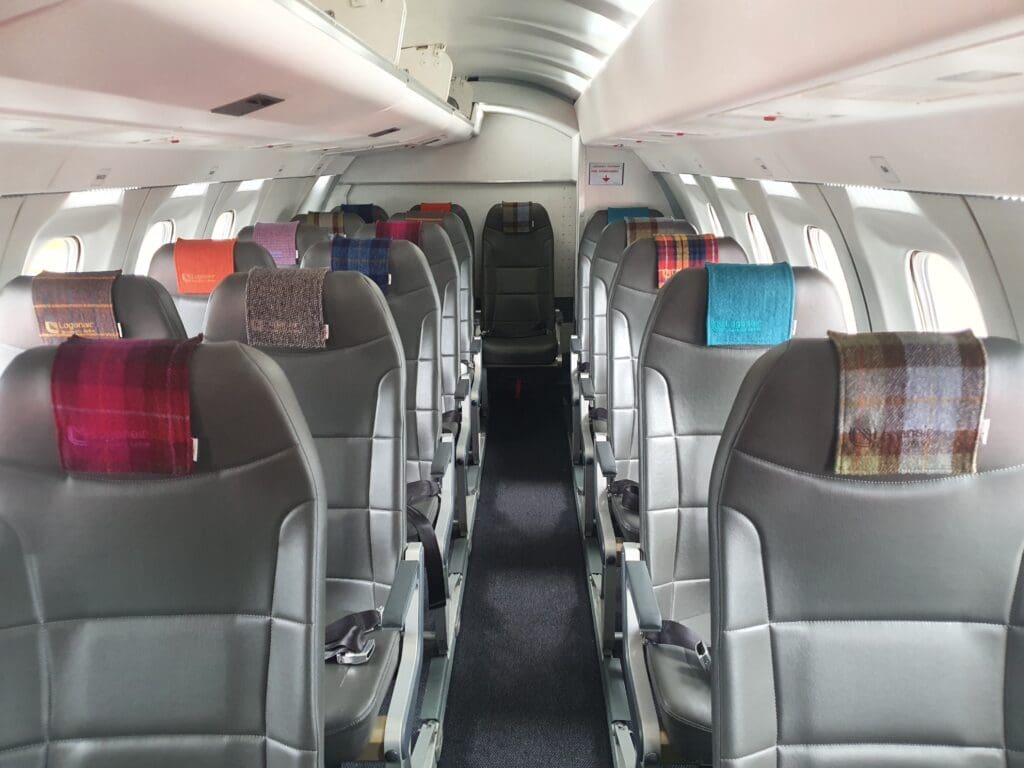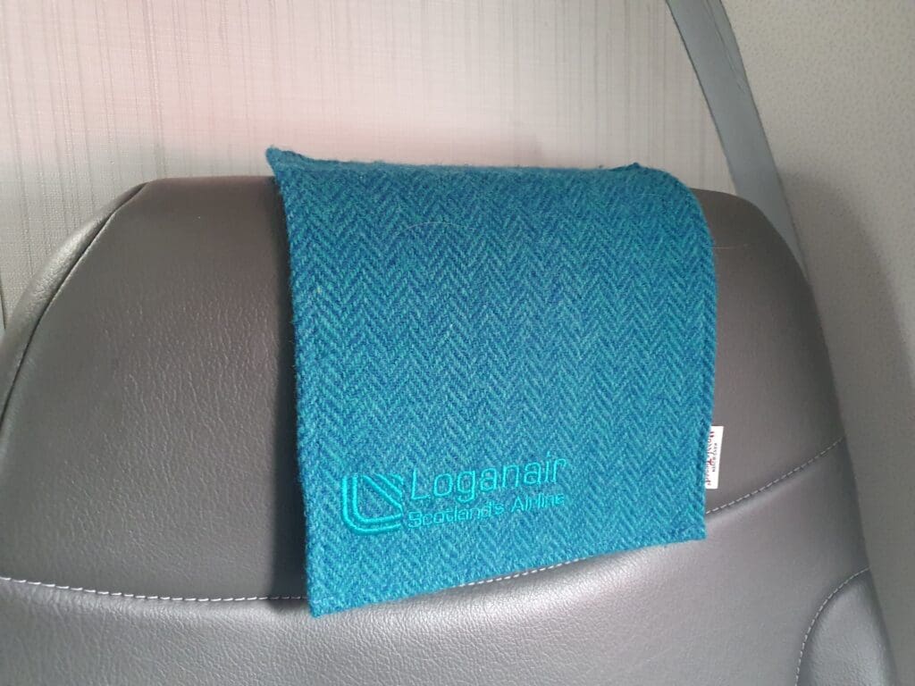 With Loganair having commenced an extensive interior refurbishment programme in 2016, today all of the carrier’s Saabs feature a smart interior consisting of 34 modern slimline seats covered in a (faux?) elephant grey leather which sit in a 2-1 configuration on raised platforms on either side of the aisle. Each of these is topped with smart-looking and regionally appropriate Harris tweed fabric antimacassars of varying colours, each of which features Loganair’s logo. Interestingly, unlike the two Loganair Saab 340Bs that I had flown in the previous year, this Saab did not feature a bank of four seats in the rearmost row, with the last row (Row 13) featuring a bank of three seats, and a small storage cupboard on the left-hand side.