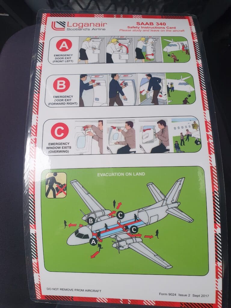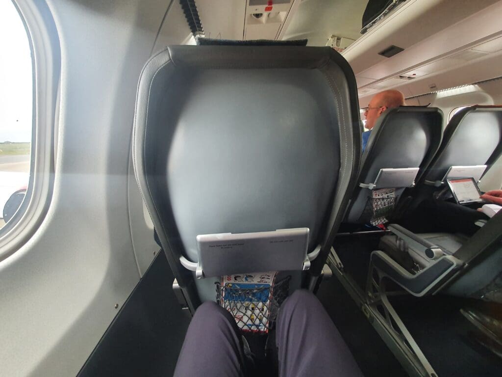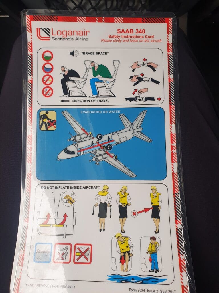 With few passengers in front of me, as I journeyed down the short cabin, it did not take long to reach Seat 12A. Once I had squeezed my bag into one of the small overhead lockers (these positioned only above the bank of two seats as is the case on many aircraft with seats in a 2-1 configuration), I took my seat and settled in for the flight ahead. Despite their thin appearance, I was pleased to find the seat to be soft and comfortable, with a good amount of legroom for a regional turboprop. As with most airliners, all passengers on the Saab 340 can enjoy the luxury of their own air vent, reading light and flight attendant call bell. Upon first glance, I found the area around my seat to be clean and in good condition with limited signs of wear and tear; however, later on, I couldn’t help but notice some well-ingrained dirt and stains on the tray table. Examining the contents of the seatback pocket, this contained a safety card and a plain white sickbag, with Loganair’s Flightlog Magazine having migrated to the digital world many months prior at the start of the pandemic.