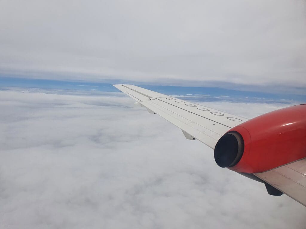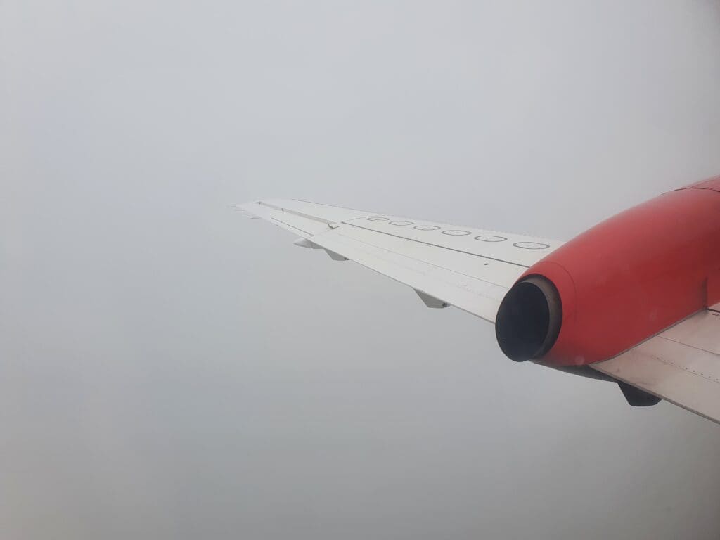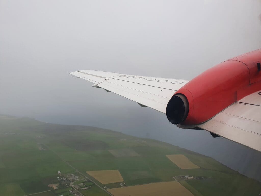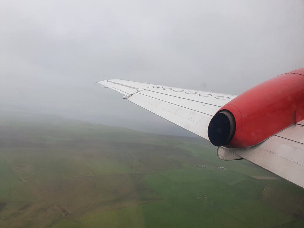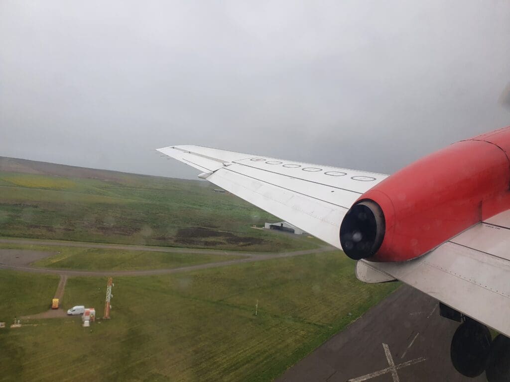 At 1533, the Saab commenced its short taxi to the end of Runway 27, entering this without holding before backtracking and turning around. Once there, at 1536 the two engines noisily powered up with the brakes held causing plenty of noise and vibration. As soon as these were released, the Saab went flying down the runway, rocketing upwards into the cloudy Orcadian skies in a matter of moments. During the first few seconds of the flight a bird’s eye view of the green fields that sit between Kirkwall and its airport before heading up into the thick grey clouds before reaching the town. Several minutes after taking to the skies, the flight attendant performed their post-departure announcement during which they advised passengers to keep their seatbelts on whilst seated and informed on the location of the toilet at the front of the cabin.