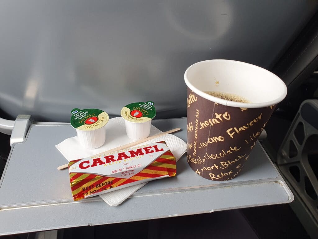 Once safely through the clouds and up in the blue skies, the seatbelt signs were extinguished and the flight attendant rolled out a small trolley from the forward galley, commencing the onboard service. Whilst this was my third flight onboard one of Loganair’s ‘mainline’ (i.e. Embraer or Saab operated) services, these flights had occurred in 2020 and 2021 before the airline’s reintroduction of their famous onboard service. Excited at what treats were in store on the ride down to Glasgow, the flight attendant made good progress and they journeyed through the cabin and reached my row at the rear of the Saab within around five minutes – just in time for a few gentle bumps. Opting for a coffee, this was poured into a paper cup and handed over to me with two pots of milk, a wooden stirrer and a serviette. Afterwards, I was invited to take a snack from the appropriate Scottish snack basket containing Tunnock caramel wafers and Walkers shortbread. Whilst this was by no means the most extensive inflight meal, this was better than can be expected on most domestic flights in the UK and I was certainly left with nothing to complain about regarding this. After completing this service, the flight attendant temporarily settled down in the rear row for a short break.