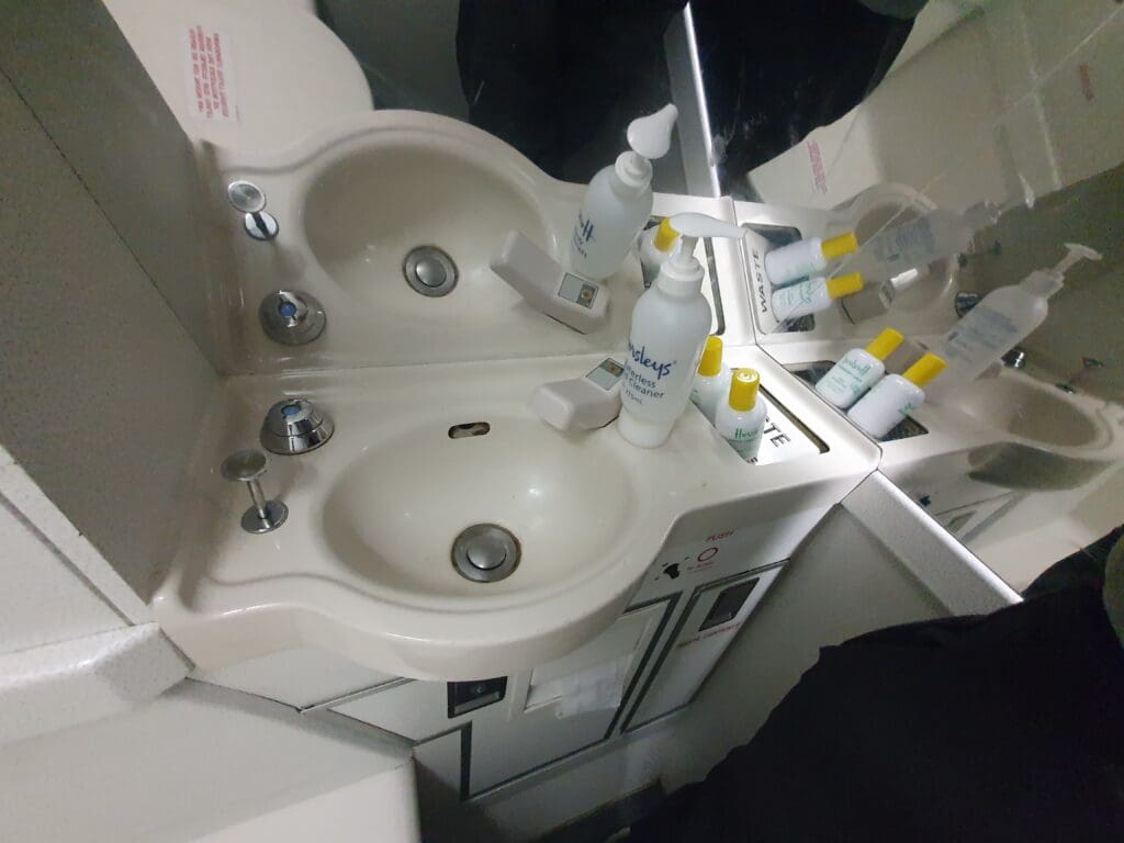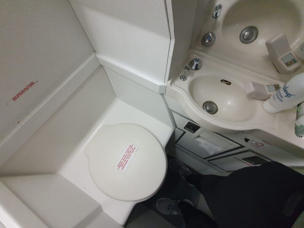 Once this announcement came to an end, I decided to make a quick trip to the toilet at the front of the cabin. Feeling slightly self-conscious as I journeyed through the aircraft I soon opened the door and performed some contortionism as I attempted to squeeze into this. Whilst slightly battered, I was pleased to find the toilet to be in a clean and tidy state, stocked with all the basics that you’d expect to find in an aircraft lavatory. However, as is sometimes the case on small-ish regional airliners, this did lack water although antibacterial gel was provided in place of soap and water.