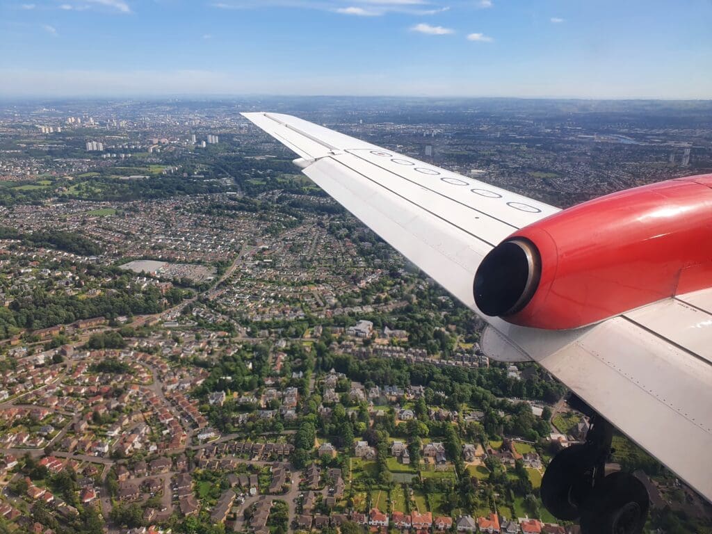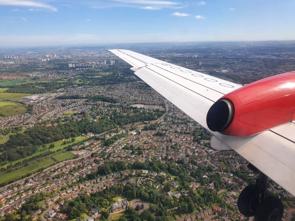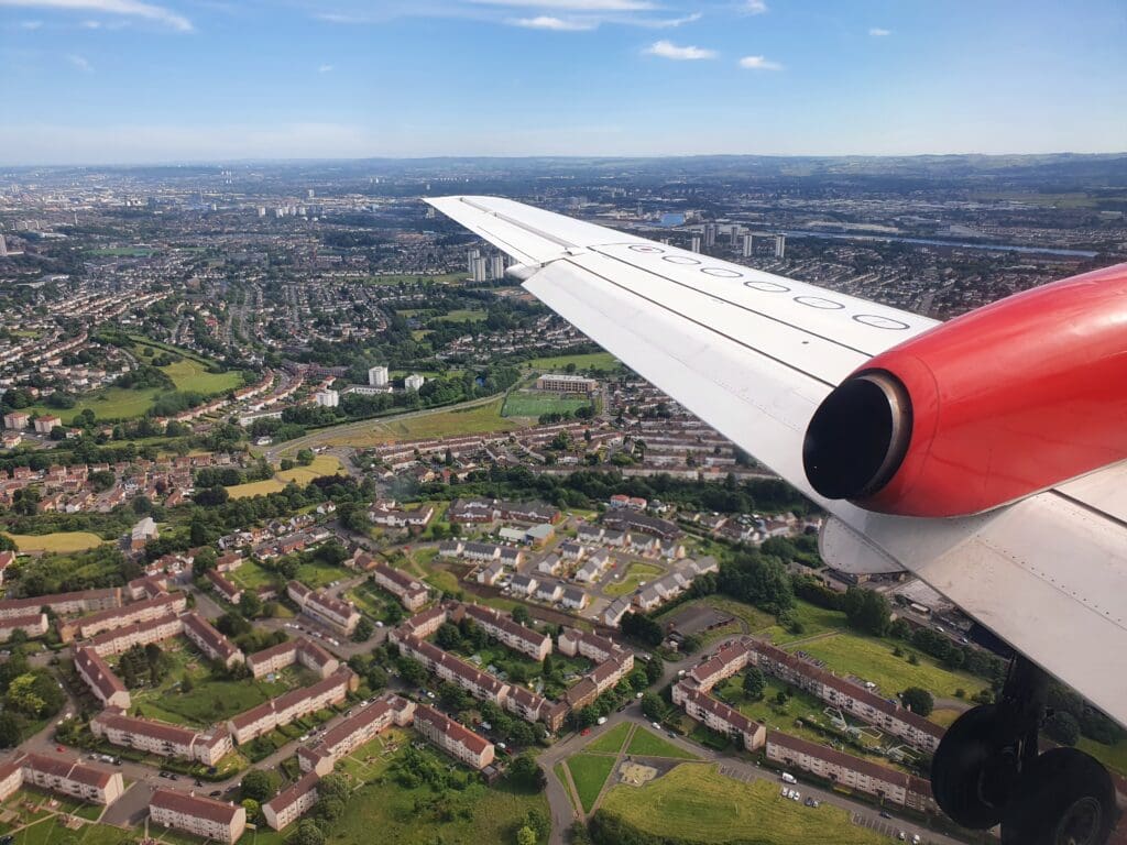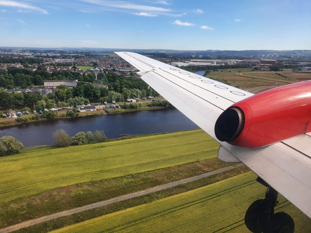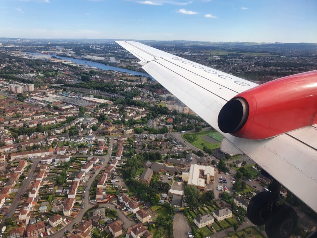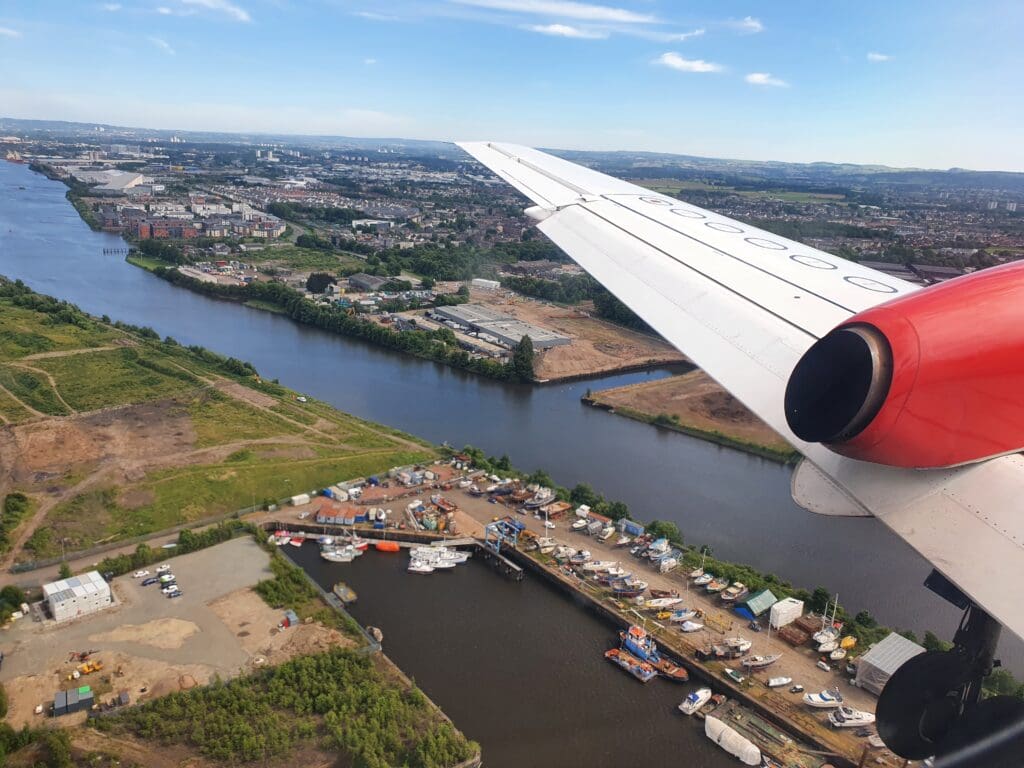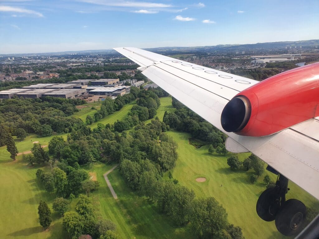 Following a couple of minutes of fells, the scenery once again sank downwards and soon the suburbs of Glasgow appeared beneath the aircraft, with the city centre visible in the distance. After passing over the East Dunbartonshire towns of Milngavie (pronounced mul-GHY) and Bearsden, the flaps and landing gear fell into position as we crossed over Glasgow’s western suburbs with the city centre visible in the distance. As often seems to be the case, at this point in the flight we were bounced about a fair bit. After crossing over the town of Yoker, made famous by Scottish comedian Limmy, the Saab reached Glagow’s famous River Clyde and sank down over this before passing the Renfrew Golf Club and River Cart.