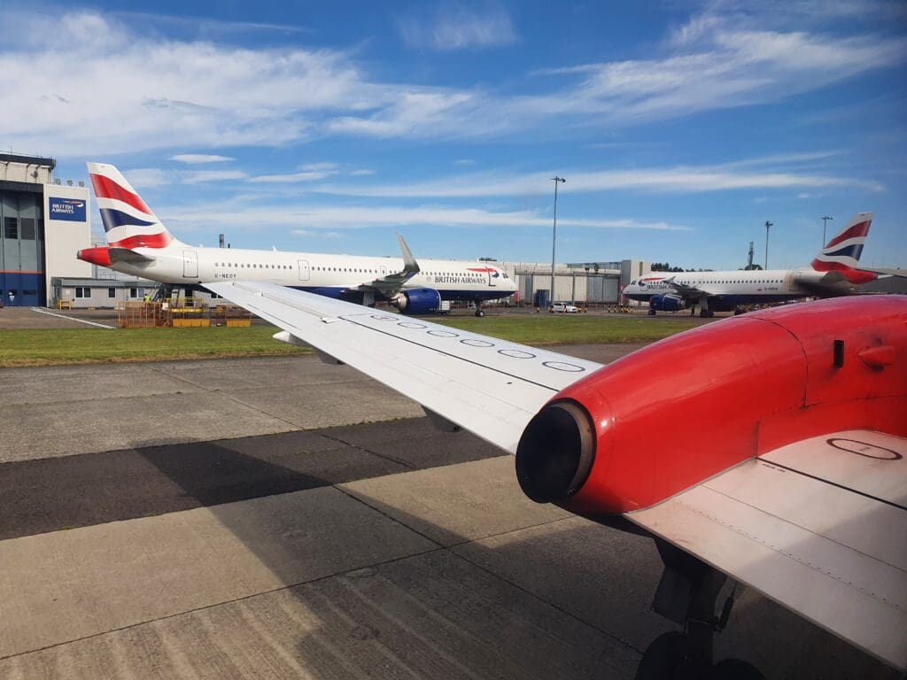 Soon vacating the runway, the aircraft then made its way past the terminal where a cluster of the usual airliners could be seen including Jet2 and TUI Airways Boeing 737-800s waiting to shuttle holidaymakers off to holiday destinations in mainland Europe, several locally based EasyJet and Loganair aircraft and a British Airways Airbus A320 waiting to be pushed back and commence its journey back down to London Heathrow. After passing the terminal, the aircraft turned right and trundled past British Airways’ Glasgow maintenance facility where an Airbus A319 and Airbus A321neo could be seen before cautiously turning into stand 1 and coming to a halt next to Loganair’s sole de Havilland Canada Twin Otter.