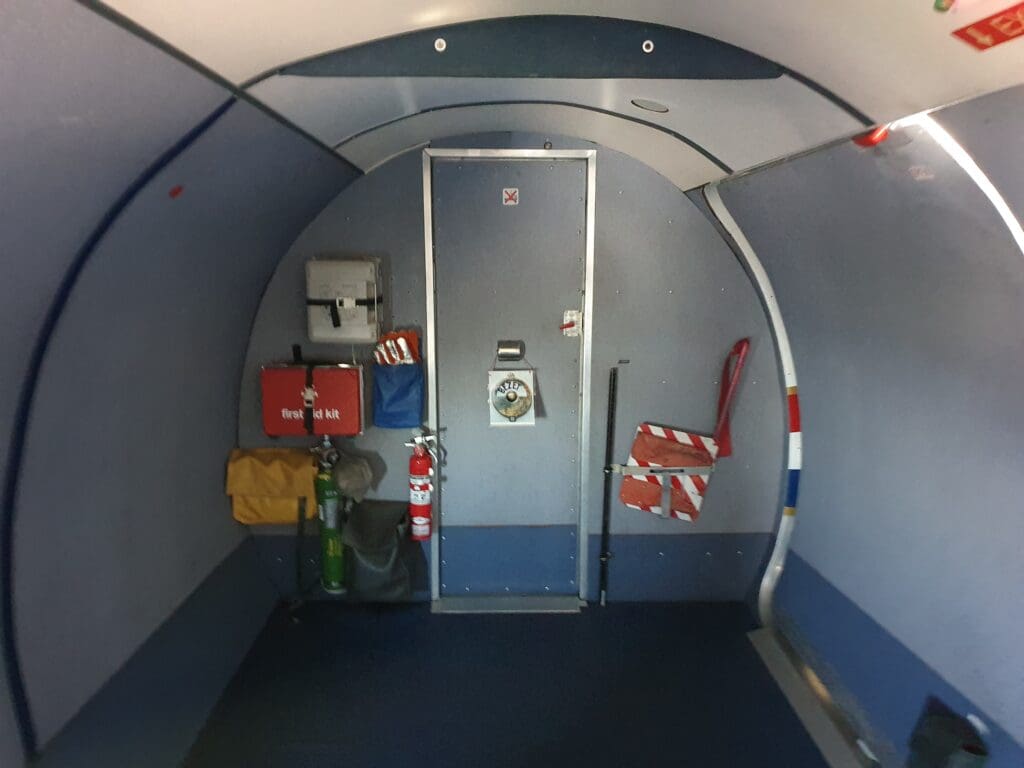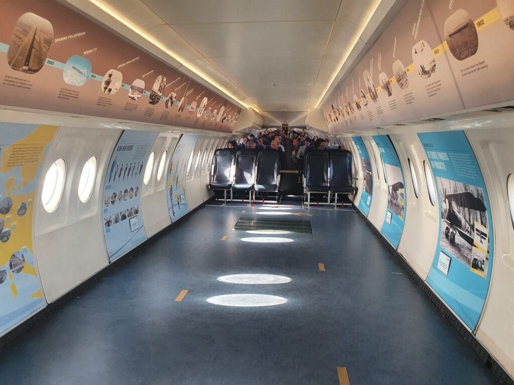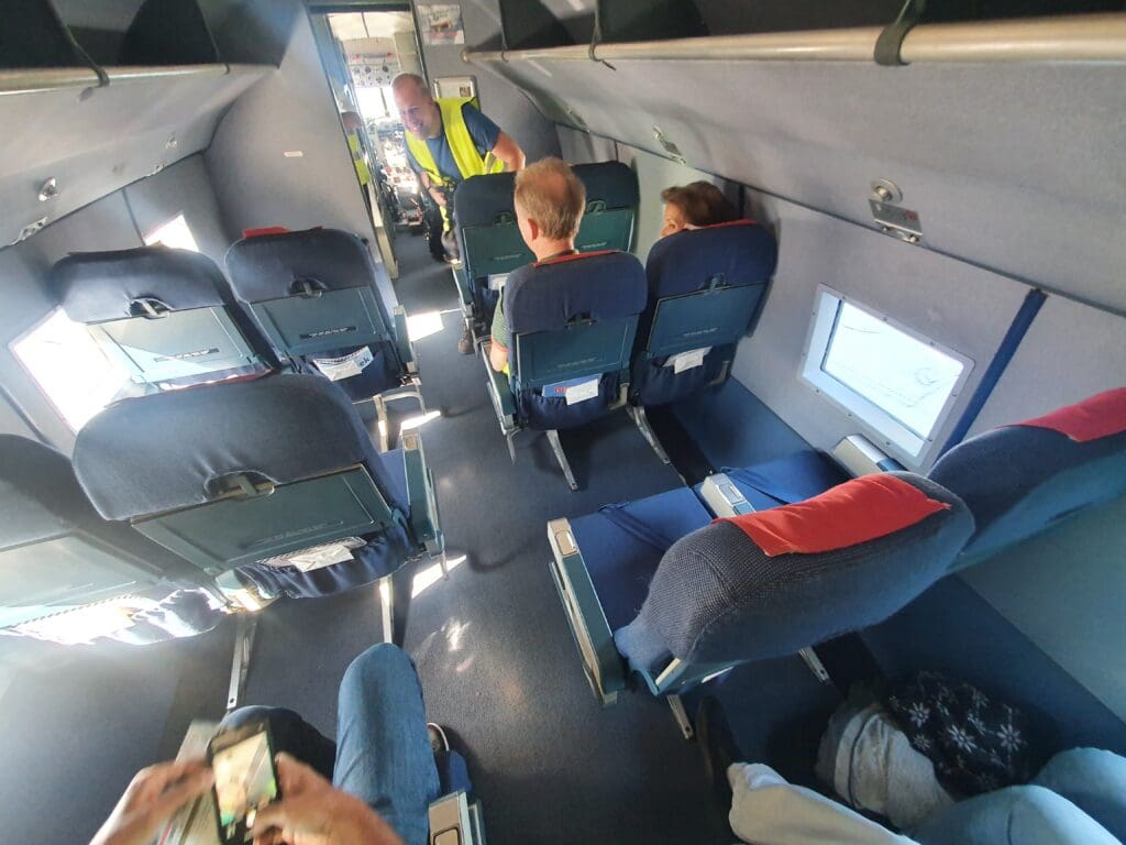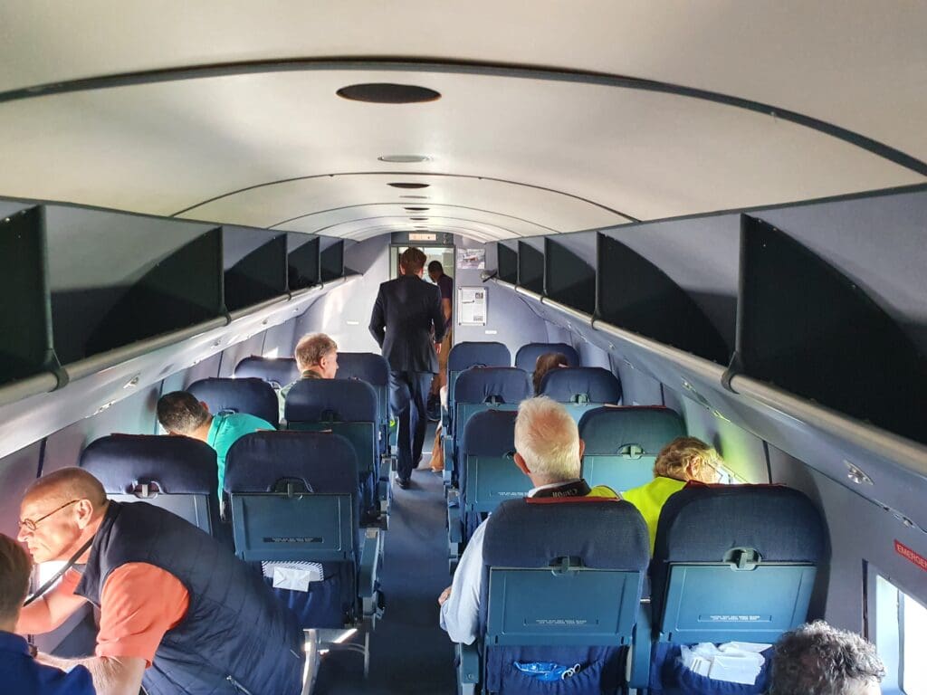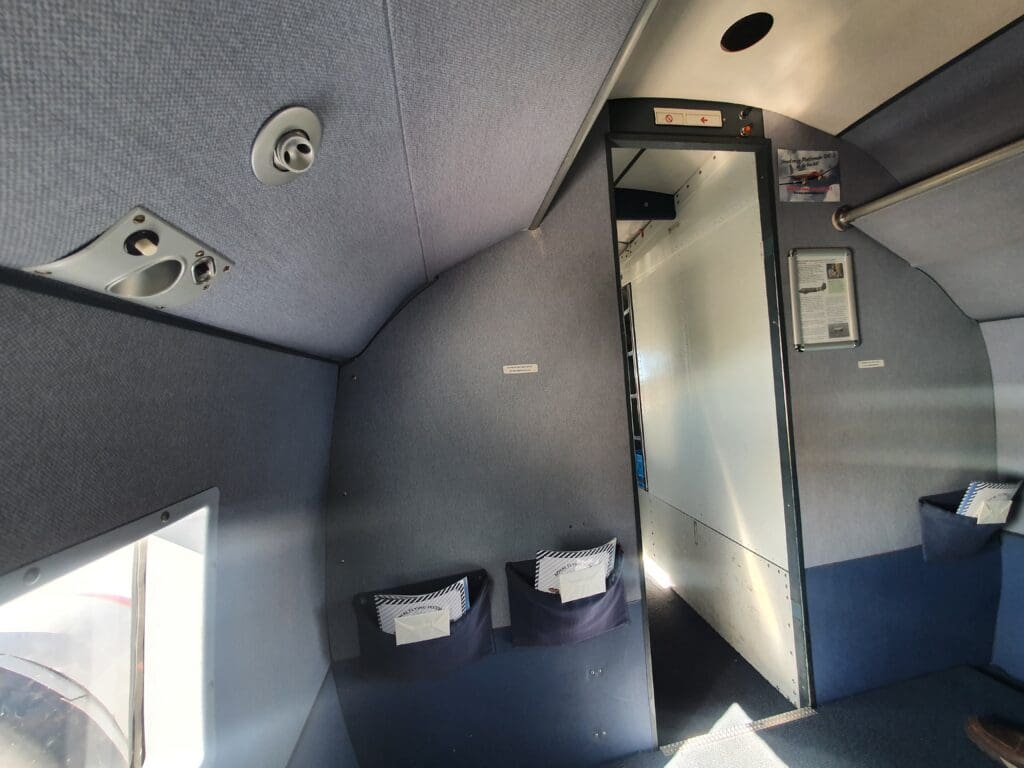 Once the Boeing 767 had taxied past with the elderly rock stars, the flight attendant, a former KLM steward who was now moonlighting as one of the world’s few remaining Dakota flight attendants appeared and gave a friendly welcome to the excited passengers. Being one of the first to board, I made my way up the short DC-3 specific airstairs that had been positioned up to the wide entry door at the rear of the aircraft. Upon entering this, I was warmly greeted in Dutch and found myself standing at the spacious area at the rear of the Dakota, with the out-of-service lavatory and a multitude of safety equipment to my right, and the main cabin to my left, with the flight attendant’s thin jumpseat located straight ahead.