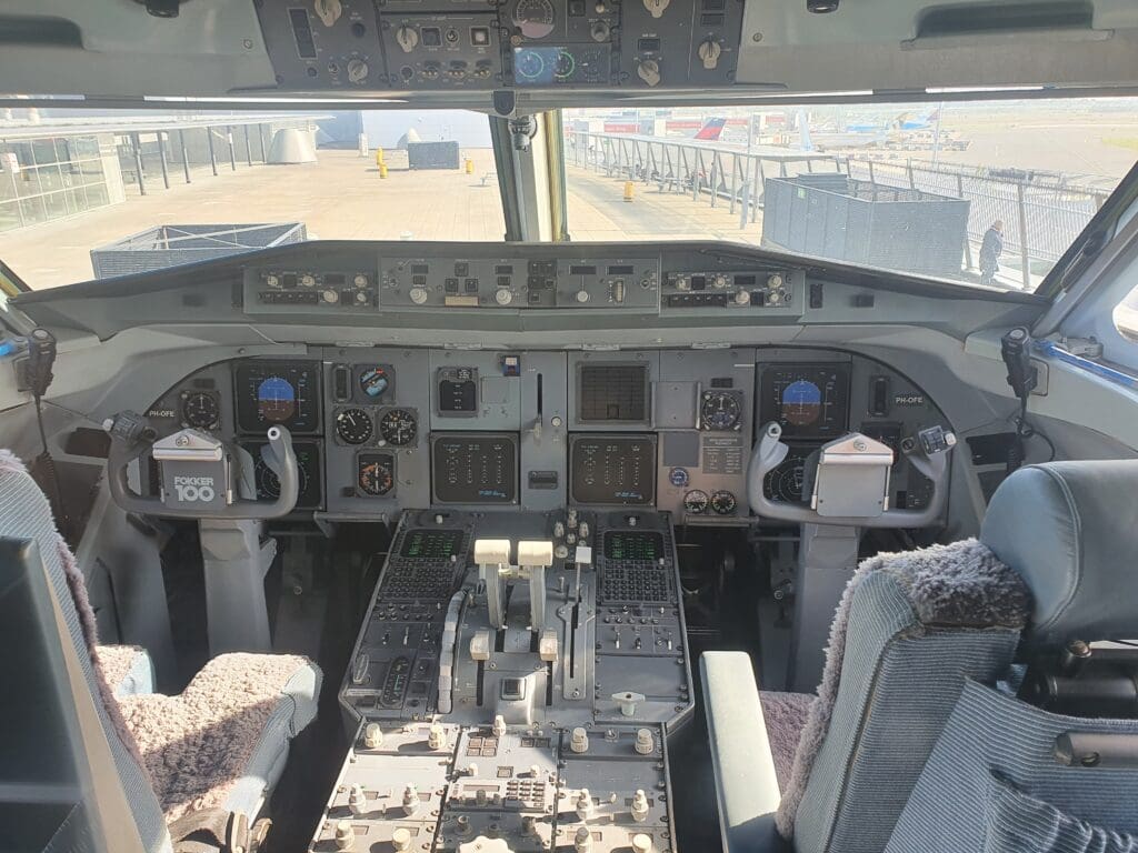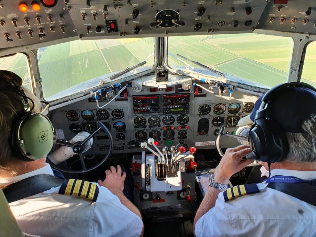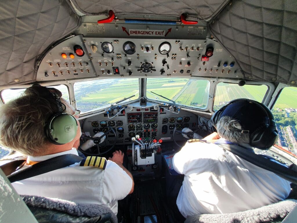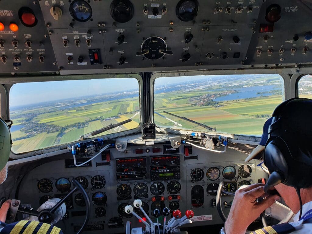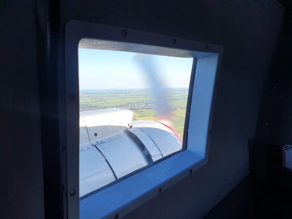 With this flight being the Zuid-Holland tour, after leaving Schiphol the aircraft made its way towards the city of Utrecht, passing just to the west of this allowing for a view of the cluster of buildings of the city centre as the aircraft then headed south and began an elongated circle, flying as far south as Gouda before heading back north and commencing its return to Amsterdam. As we journeyed over the fields, I took up the flight attendant’s offer to visit the cockpit, with the experience of standing up and heading up to the flight deck seeming to be a bit surreal given the myriad of strict regulations surrounding commercial flying today! After heading through the narrow passageway, passing the navigator’s station where my grandfather had spent many an hour (now mostly devoid of equipment) before arriving at the front of the aircraft. Spending about a minute there, I watched as the two pilots flew the aircraft low over the Netherlands’ countryside, cautiously looking out for other aircraft and flicking a few switches in the process.