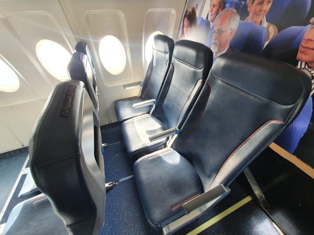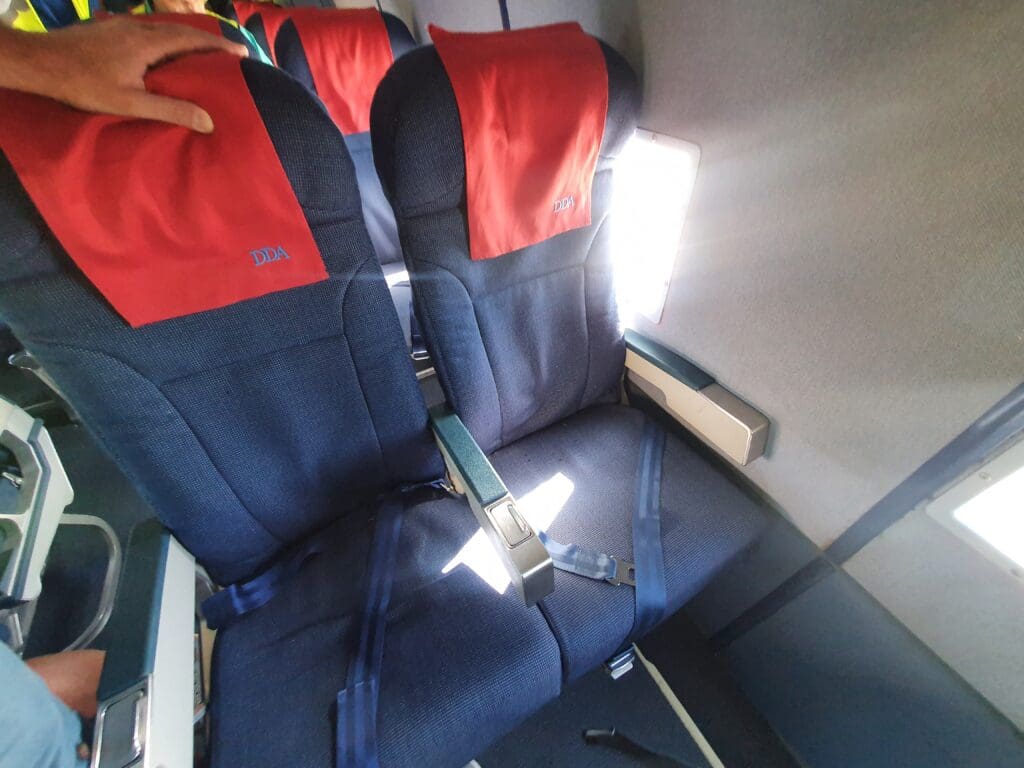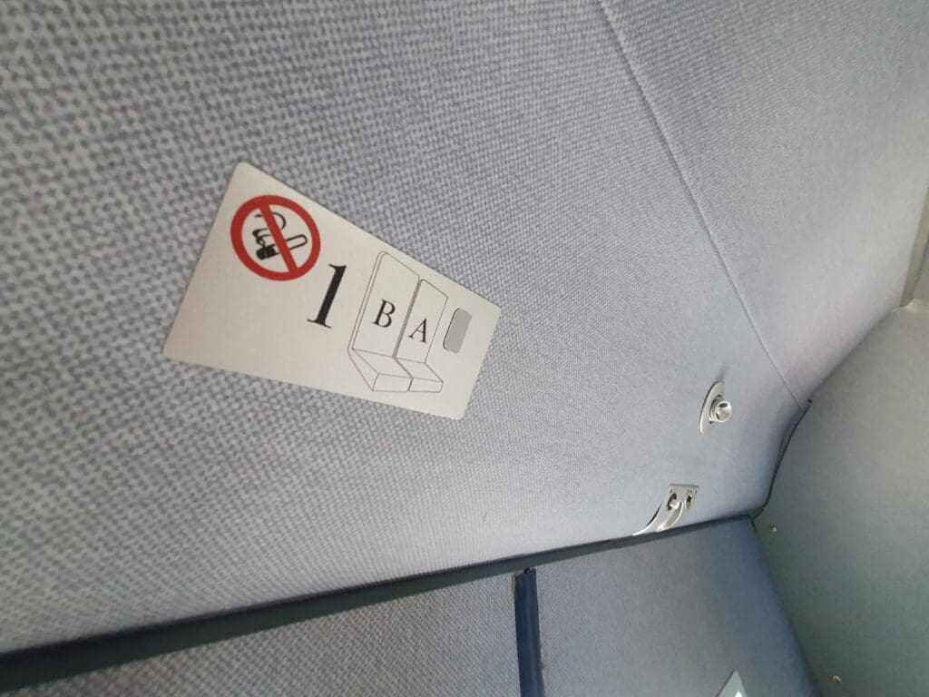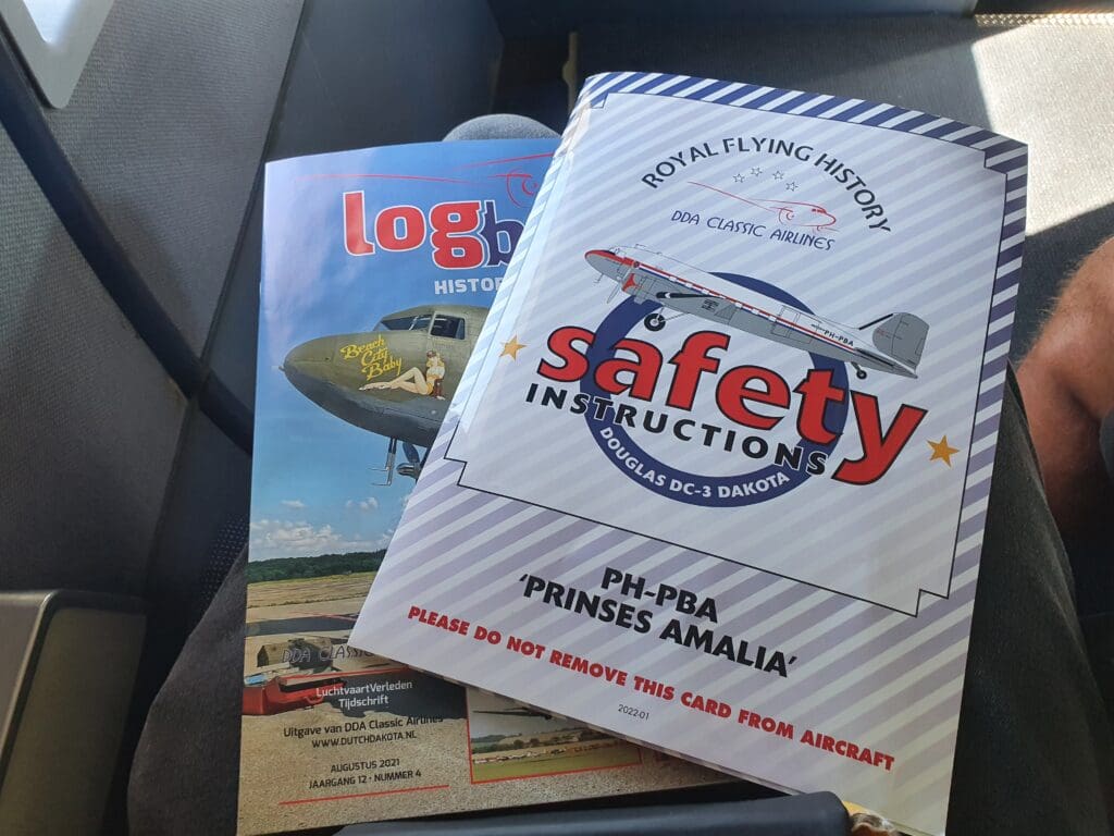 Since my previous flight in the Dakota in 2007, the large and very comfortable seats that had been arranged in a 2-1 configuration have been replaced by slightly more modern-looking and thinner seats arranged in a 2-2 configuration. With this work having been undertaken in cooperation with Fokker between the 2016 and 2017 flying seasons, and increasing the maximum number of passengers from twelve to eighteen. Whilst slightly more modern than the seats that these replaced, were these to be fitted to a ‘regular’ commercial airliner, I would label these as undoubtedly retro, sporting chunky armrests complete with ashtrays. With these seats appearing to be a little familiar, I wracked my brain attempting to decipher where I had seen these before. Following a few searches, these seem to be identical to those that had been fitted to Scandinavian Airlines’ long-retired McDonnell Douglas MD-80 fleet. Turning to their design, these sported a subtle repeating pattern of light dots, with each topped by a smart-looking red fabric antimacassar complete with ‘DDA’ stitched into this in the bottom right-hand corner. Meanwhile, a reading light and air vent could be seen along the sides of the cabin above each seat, although there appeared to be only one of each for each pair of seats. Despite the lack of inflight catering on most flights, these feature large tray tables, meanwhile, seatback pockets could be seen which contained the obligatory safety card, a copy of the latest edition of DDA Classic Airlines’ Logboek magazine and a sick bag featuring the carrier’s logo. In terms of design, the overall theme of the Dakota’s interior was blue, with blue plastic cabin panelling and blue carpets.