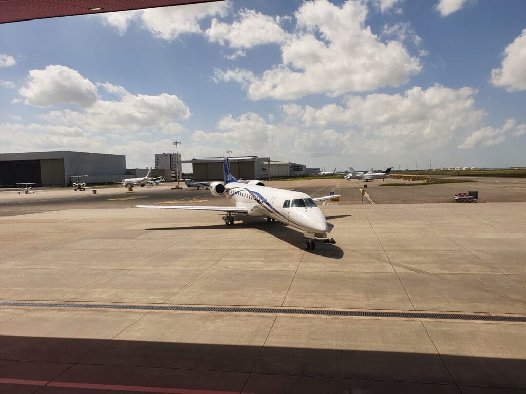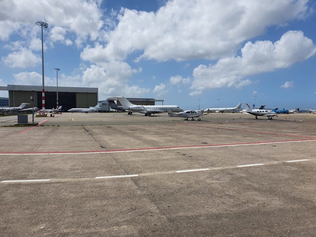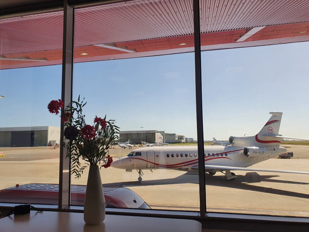 Now with plenty of time before our new departure time, given the sunny weather, I decided to head outside and soak up some sunshine, undertaking another quick walk before making my way back into the terminal and up to the waiting room. Fortunately, I arrived back just in time as the staff members were passing through this with a tray of stroopwafels and chocolate chip brioches, and handing out small cartons of fruit juice. Once I had polished off a sugary combination of an apple juice and stroopwafel, I turned back to the action outside. At 1700, a very sleek and shiny-looking luxurious Dassault Falcon 7X appeared and parked up right outside the waiting room. Whilst this was operated by Exxaero, named Johan Cruyff and with the famous player’s number ‘14’ on the tail, and registered PH-AJX, it appears that this jet was dedicated to the local football team, AFC Ajax. Once the cabin door had been opened, several athletic-looking figures emerged although it is unknown whether or not these took the form of some of the team’s players. Nevertheless, this caused some commotion with several passengers snapping photos of the jet, only to be scolded by the DDA Classic Airlines staff who reminded passengers that photography was prohibited.