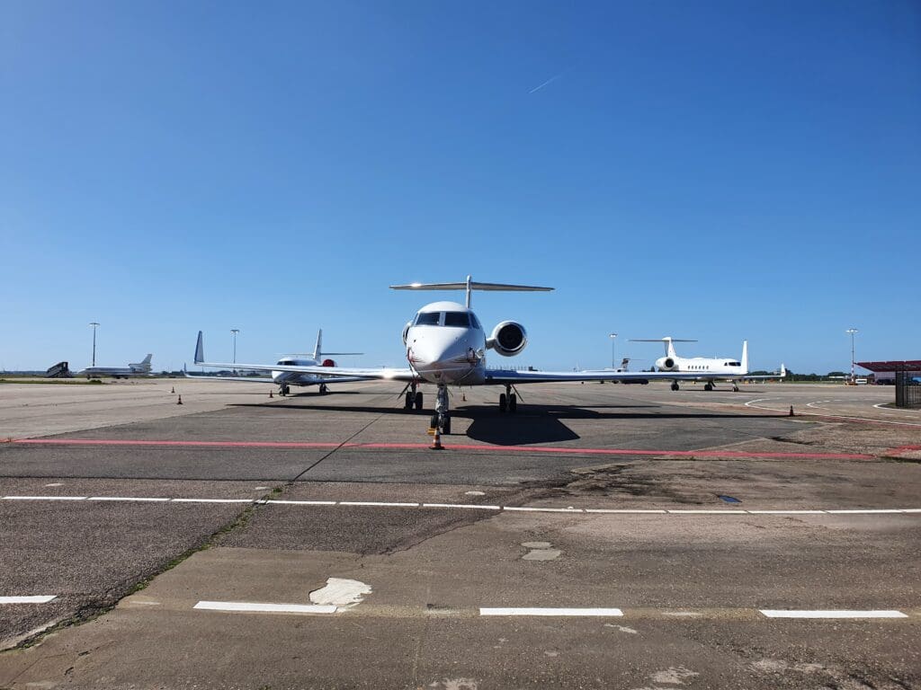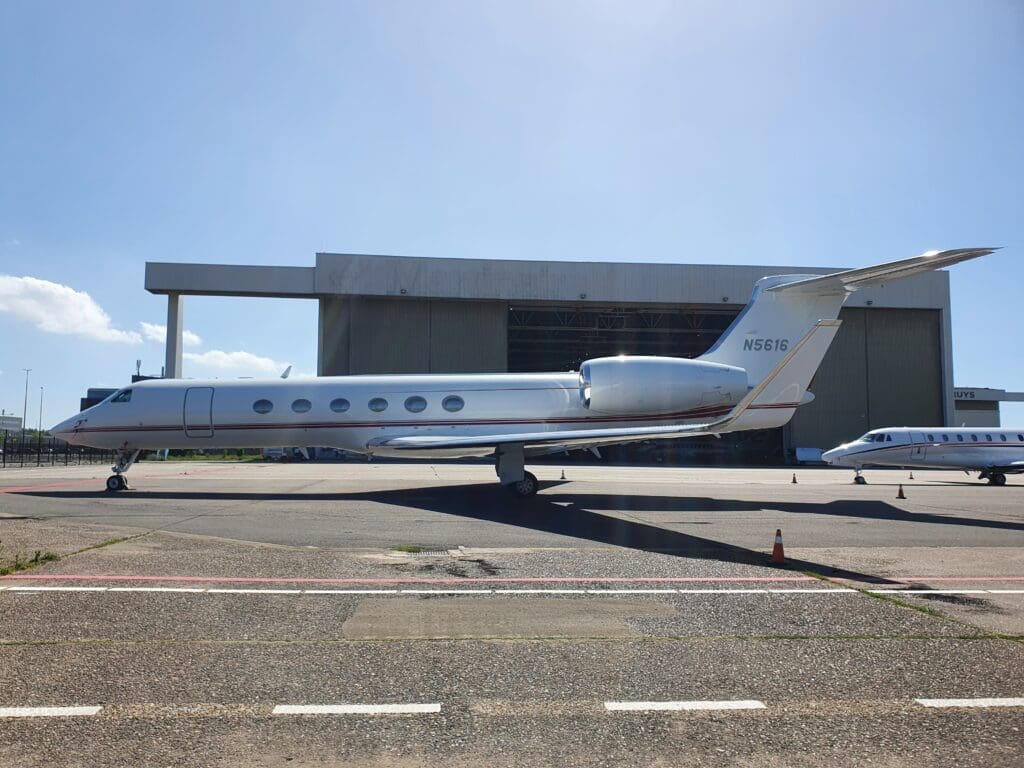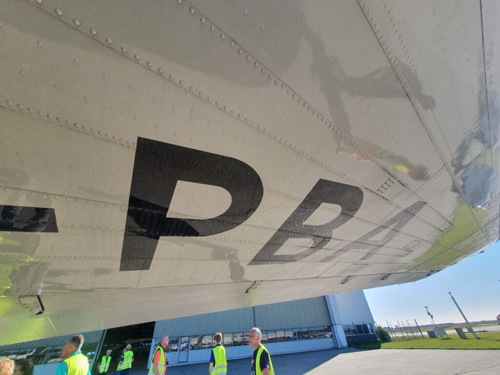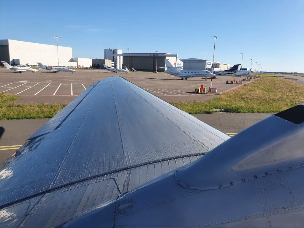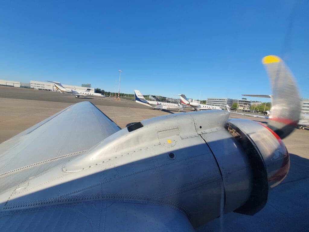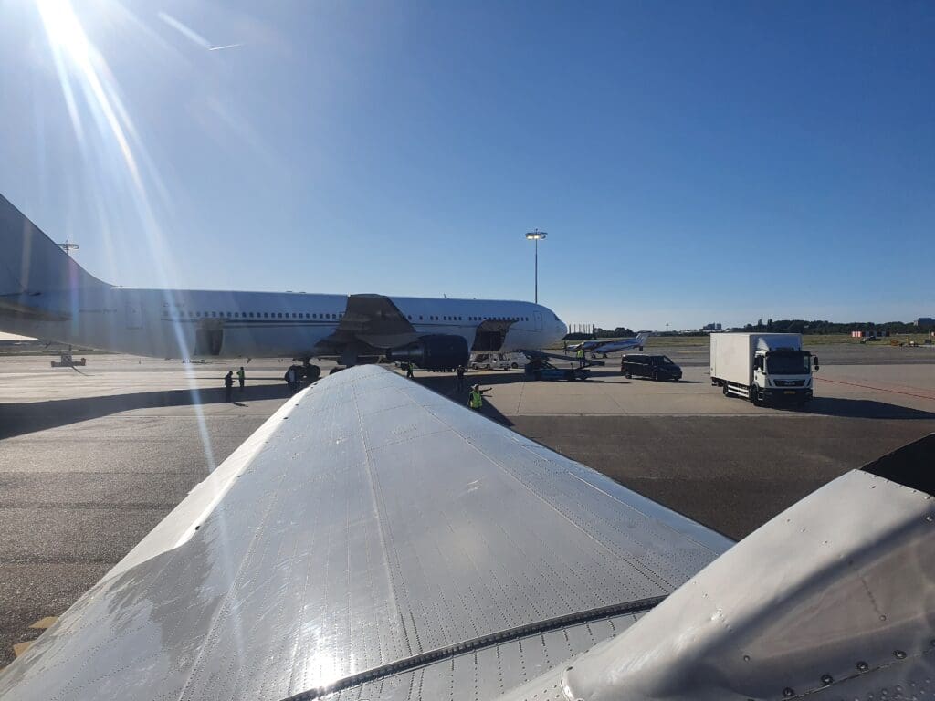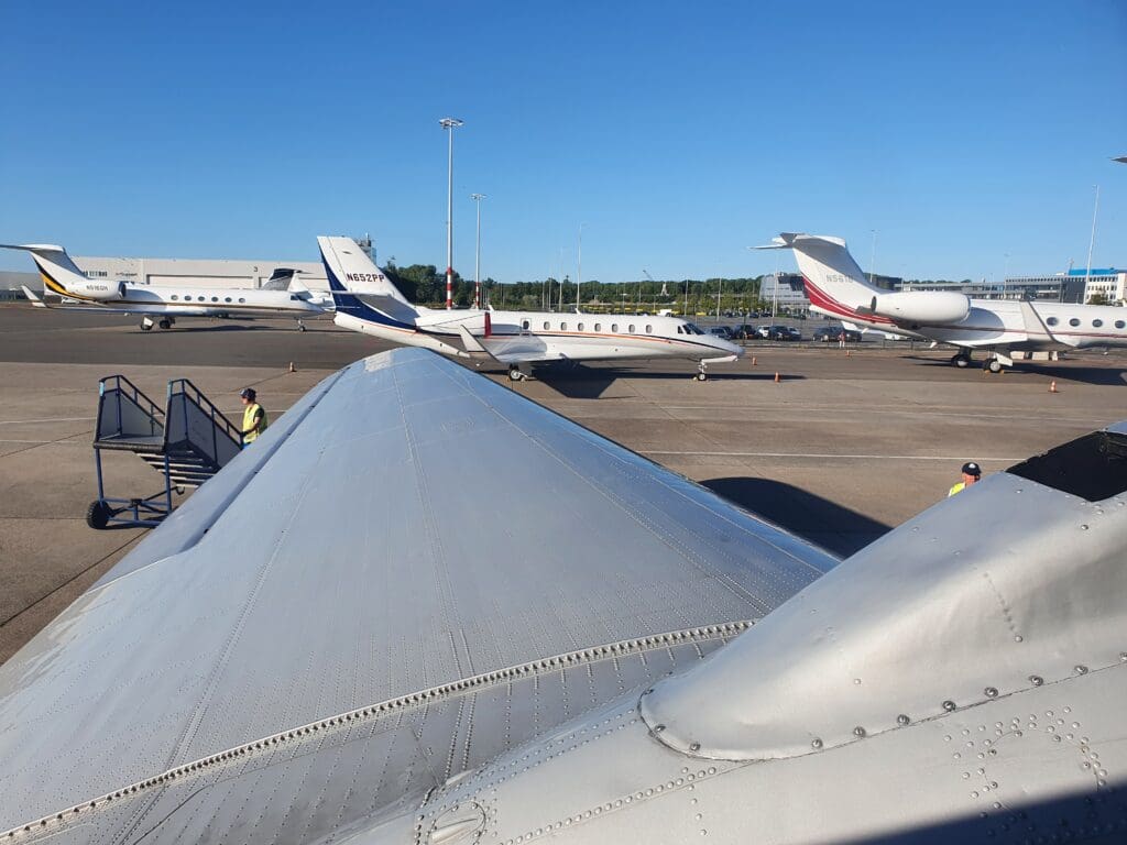 Once onboard the plush minibus, we journeyed out across the apron where the Dakota could be seen amid a sea of private jets. As we neared this, my first impressions were that the DC-3 appeared to be relatively small, short and stubby. Indeed in terms of length, this was almost identical to the nearby Cessna Citation Sovereign. Once the bus came to a halt, the doors opened and passengers spilt out onto the apron where they were advised to remain near the bus whilst a small army of ground crew could be seen readying the aircraft for its final flight of the day. After the second minibus arrived, the captain then pointed out some of the features of the DC-3’s exterior including its two massive Twin Wasp engines and offered to snap some photographs of passengers before boarding. At this time, there was some slight excitement from enthusiasts as two rare types taxied past – a Dornier 228 belonging to the Dutch Coast Guard and a Gippsland GA-8. Meanwhile, at another vacant stand, plenty of police, security, an ambulance and people carriers could be seen, and soon enough an aircraft arrived at this stand. As it happened, this was the Rolling Stones jet, an Aeronexus Boeing 767-35D shuttling the band and their entourage between concerns on their 2022 tour.