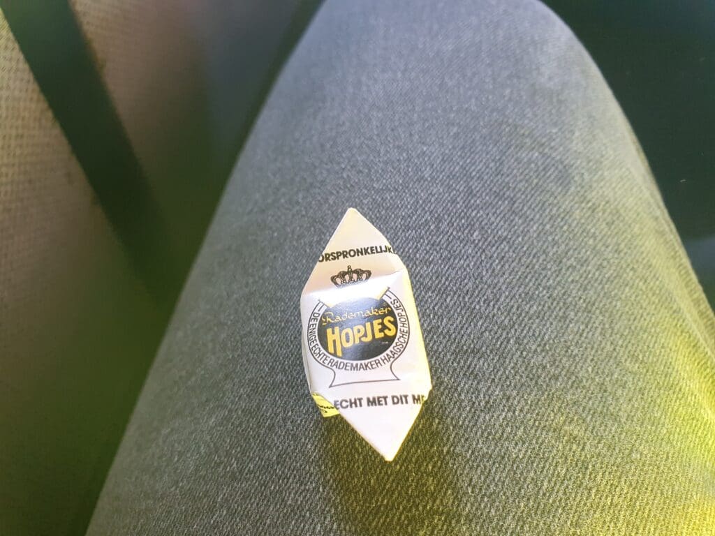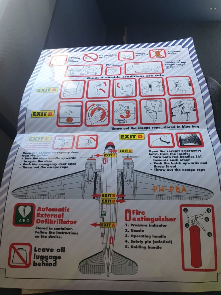 After climbing up the Dakota’s steep upwards sloping cabin, I arrived at the front row and settled into Seat 1A. In terms of comfort, admittedly the seat was a little firm although being a bulkhead seat, the amount of legroom provided was superb. It is also worth noting that all seats onboard appear to feature a fantastic amount of legroom. Inside, the cabin appeared to be clean and tidy, although as you’d expect from a vintage aircraft, despite being well cared for there were a fair few signs of wear and tear visible throughout. One thing I did notice was that when seated, the windows were at chest height, meaning plenty of bending over was needed to get a good view out of these. That evening, whilst passengers were taking their time, taking plenty of photos and soaking up the unique atmosphere of this rare aircraft, it still did not take too long for all passengers to make it onto the aircraft and get settled for the flight ahead. Once all passengers were seated, the Captain emerged and performed another pre-flight speech. This time, the captain advised that whilst the Dakota’s engines are easy to start when either warm or cold, that evening these were lukewarm and thus likely to be difficult to start and it may well end up taking a few attempts to get these to spool into life. This was perhaps mentioned to avoid worry in case these did not start straight away. Once done, the flight attendant then took to the front of the cabin and performed a welcome and safety speech in Dutch and English, pointing out the Dakota’s five exits. After this, the flight attendant then passed through the cabin with a small basket of Hopjes – hard coffee-flavoured sweets.