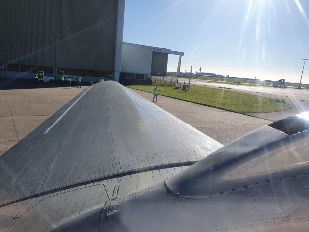 Once things calmed down, it appeared that there was still no sign that our departure was imminent and at 1730, with the Dakota still stuck far away in the distance, it appeared that the flight would not depart by 1745 as initially stated. However, a short time later, a pilot appeared who would relieve the captain that had operated the day’s other Dakota flights, and introduced themselves in Dutch and then in English. Once done, the pilot then undertook a very long and detailed speech on the aircraft’s history and features and its long and varied career. Whilst this was performed in Dutch only, I did manage to pick out a section where the Captain jokingly asked for requests of passengers’ homes to buzz these that evening. Promisingly during this announcement, the Dakota could be seen slowly journeying towards the apron under its own steam.