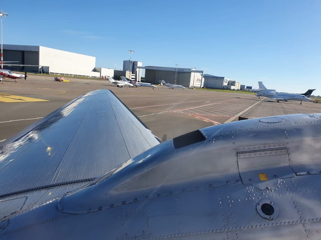 Whilst compact, this room was clean, modern and comfortable and provided a good view of virtually the entirety of Schiphol-Oost’s apron where a selection of private aircraft. These ranged in size from a Cirrus SR20 and a Diamond DA-40 up to Air Hamburg’s recently acquired Embraer Lineage 1000. Other than the Douglas DC-3, which at that time was being loaded up with passengers outside its hangar for its next flight, one fairly rare visitor took the form of a French Army Socata TBM-700 in one corner of the apron. Seeking an even better view of the aircraft on the apron, and still with plenty of time to go before check-in, I decided to head outside for a quick walk along the perimeter fence around the apron. In the car park, a fair number of aircraft enthusiasts could be seen peering through the mesh fence at the selection of aircraft on the apron. Arriving at the fenceline just in time, I watched as the Dakota’s two Pratt and Whitney R-1830 Twin Wasp engines spluttered into life with a fair amount of smoke, before the aircraft slowly and cautiously taxied away at the start of its penultimate flight of the day.
