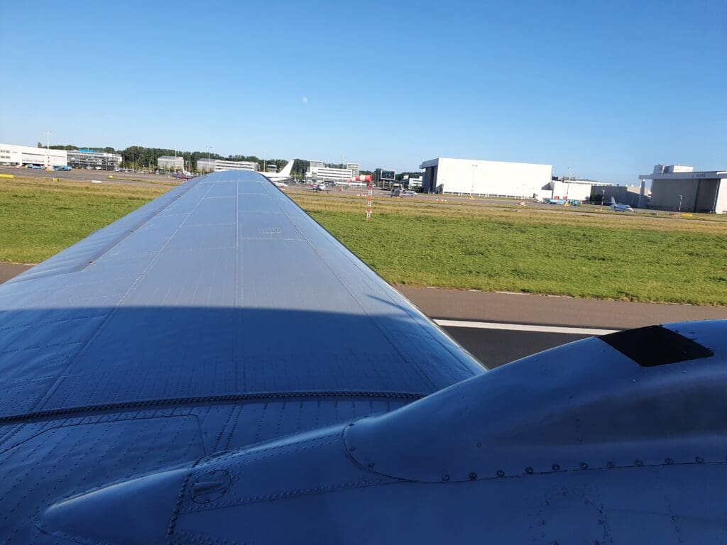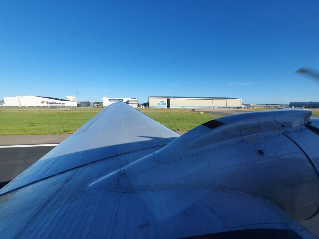 Once the engines had stabilised and the ground crew had retreated, the aircraft slowly taxied forward out of its stand and made a very short taxi over to the end of Runway 22, also known as the Oostbaan. Without holding, the aircraft made its way onto the runway before coming to a gentle halt and pausing for a couple of minutes. At 1853, the cabin was filled with the noise of the two Twin Wasps as the throttles were pushed forward and the aircraft commenced its take-off roll. Adrenaline junkies may be disappointed to hear that unlike on many airliners, the take-off roll was gentle and lacked the sensation of being pushed back into your seat. Once the tail wheel had lifted onto the ground, the Dakota continued powering down the runway and a very short time later, the entire aircraft floated up into the evening skies of Holland.