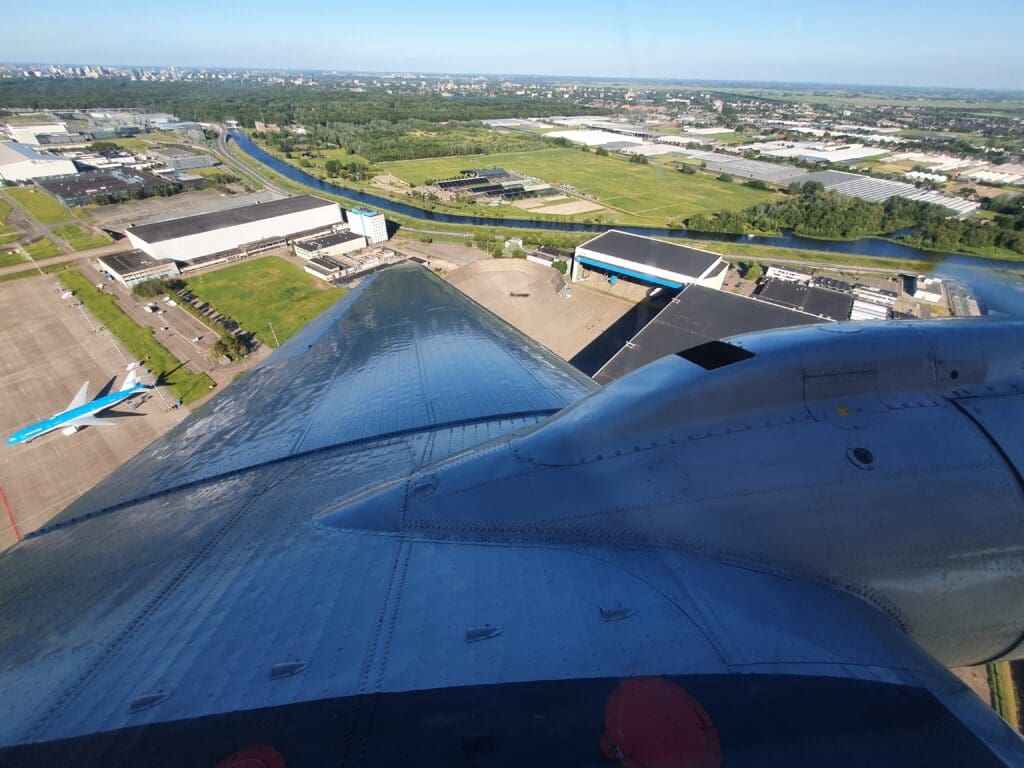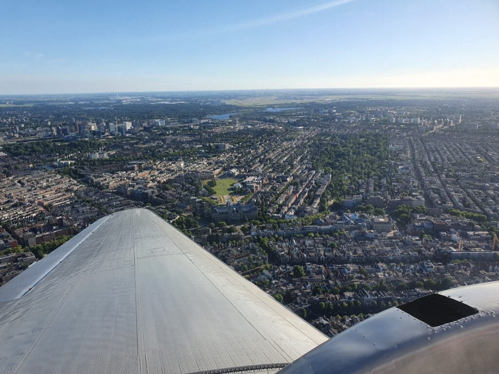 Just before reaching the IJ near Zeeheldenbuurt, the aircraft turned south and commenced its approach back to Schiphol Airport. From the centre, the Dakota made its way back over the southern suburbs of Amsterdam and soon crossed over the Park de Oeverlanden before crossing over the perimeter fence. Following 33 minutes in the air, the aircraft’s two tyres made a gentle touchdown on Runway 22 and the aircraft decelerated gently before the incline returned as the Dakota’s small tailwheel was placed down on the runway.
