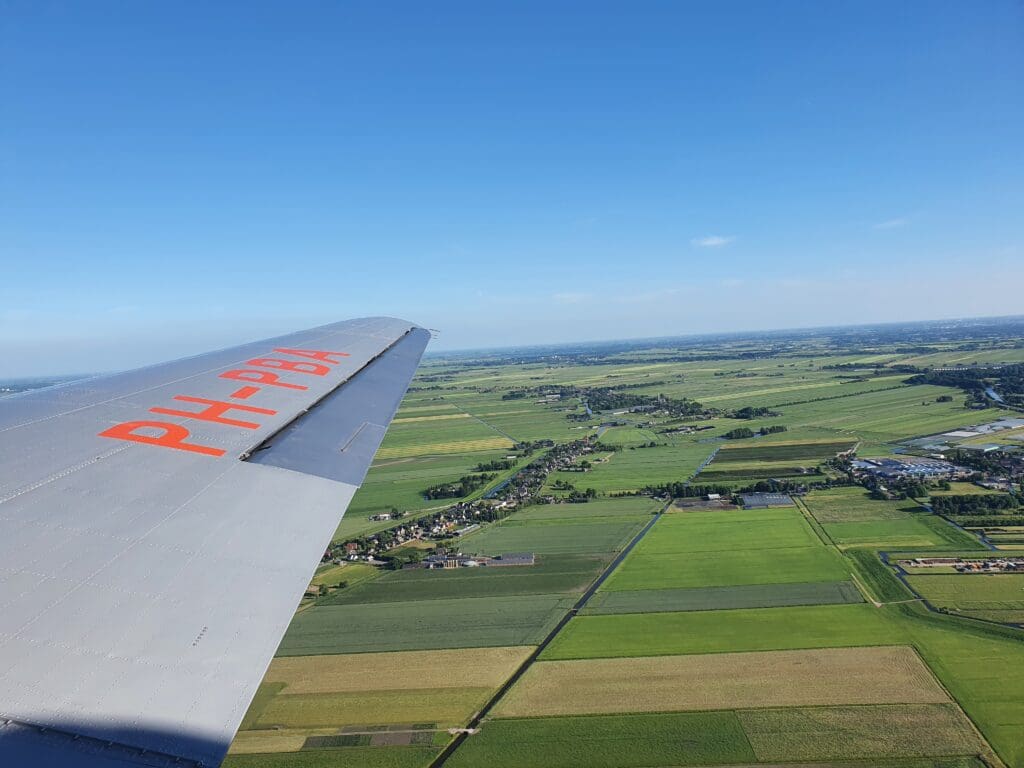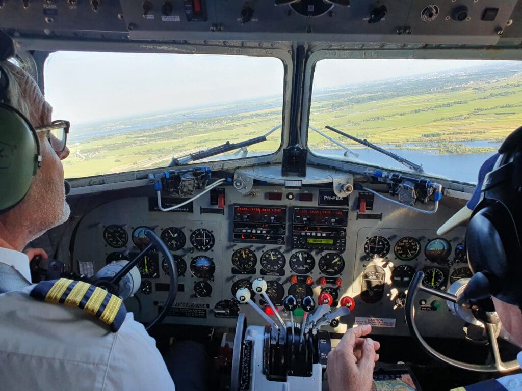 Almost as soon as the aircraft had taken to the skies, the aircraft banked left allowing for a good view of the KLM hangars that sit along the Oostbaan, before the Dakota left the vast expanse of Schiphol behind. At this early stage of the flight, the Dakota levelled off at its cruising altitude of just 900 feet at which point the seatbelt signs were switched off and the flight attendant announced that passengers were free to move about the cabin and visit the cockpit if they desired, the only requirement being that no more than two passengers could visit this at any one time. Meanwhile, from this moment, one of the pilots up front made regular brief announcements advising of the places that the aircraft was flying over. Thanks to the low cruising altitude and the superb weather that evening, a great view of the Netherlands’ famously flat countryside as well as its canals, fields and windmills could be seen as we trundled along at an airspeed of around 110 knots.