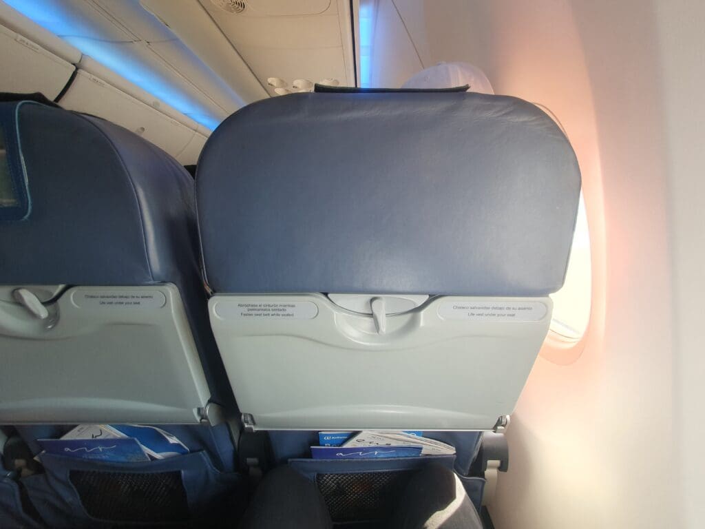 As is the case with almost all European carriers, whilst Air Europe offers a business class product onboard their narrowbody fleet, this is in a ‘Eurobiz’ format, consisting of regular economy seats with the middle seat blocked. Most of Air Europa’s Boeing 737-800s are fitted with 186 seats, which is only three less than the standard low-cost carrier configuration, and these took the form of welcomingly chunky seats, covered in dark blue pleather and topped with an antimacassar.