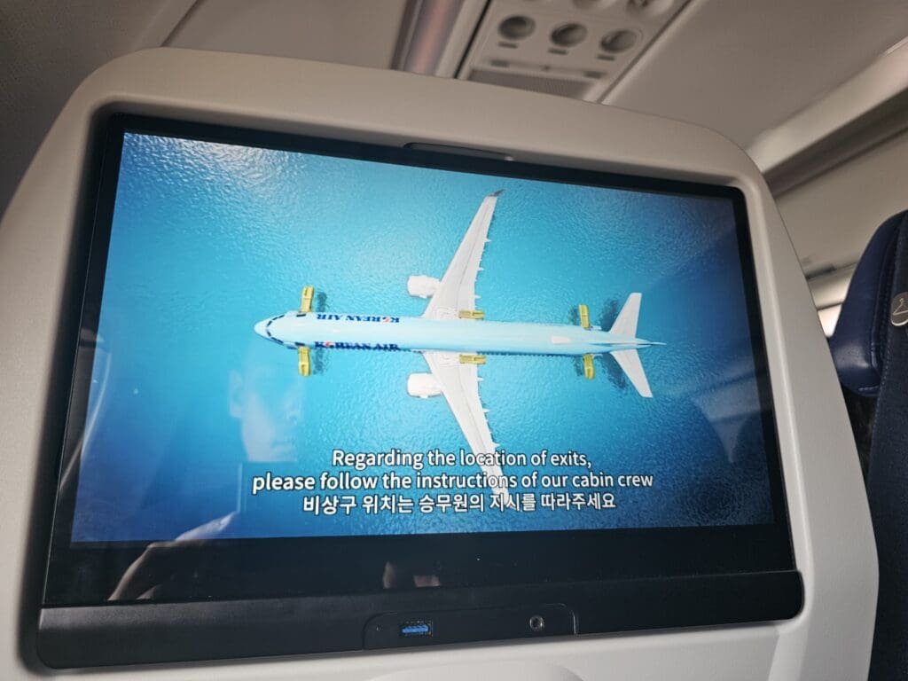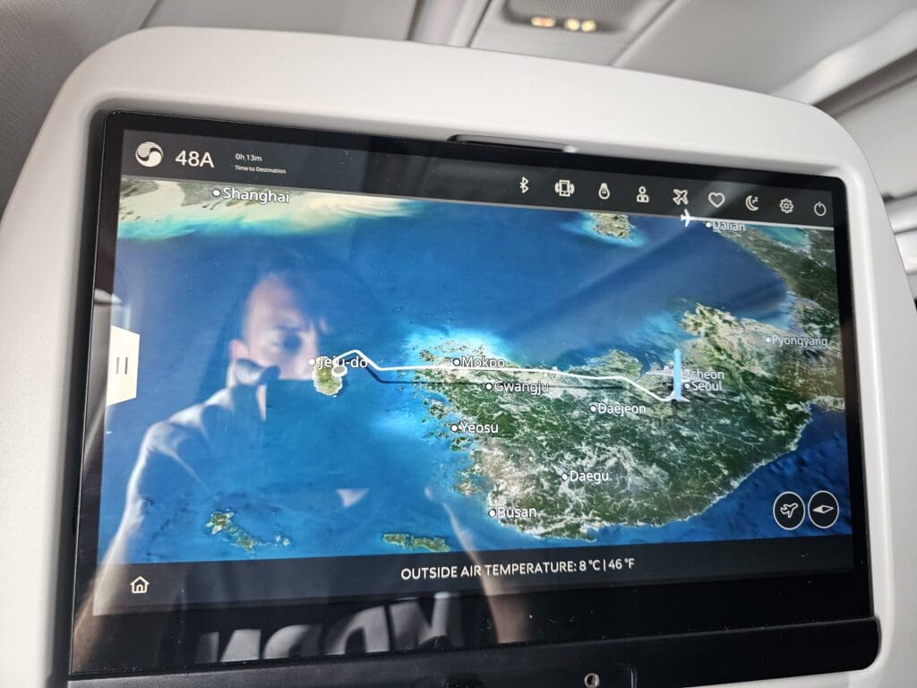 Unlike on my previous domestic flights onboard Korean Air’s inflight entertainment screen-equipped aircraft, on this flight, passengers were able to use the inflight entertainment system from boarding until disembarkation (except of course during the safety video and announcements). This was available in four languages (Chinese, English, Japanese and Korean), and was modern and sleek in its layout, loaded quickly and was highly responsive to touch. Device pairing was also offered for those who preferred to control this via their own device, which I tested and found to work without issue. Meanwhile passengers could also pair their Bluetooth headphones with their inflight entertainment screen.