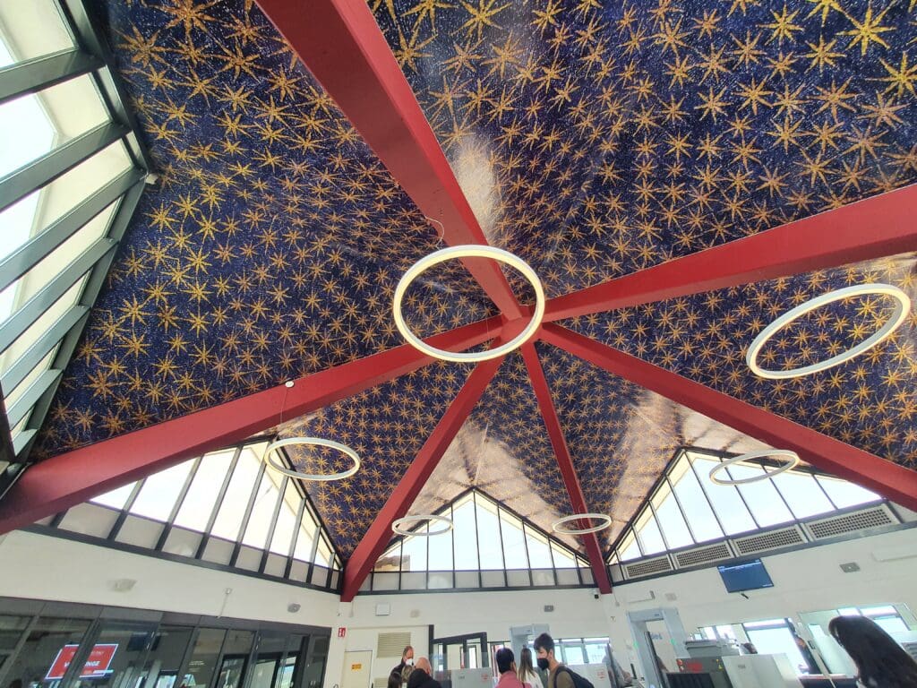Other than the check-in desks, on-display car and toilets, Forlì Airport’s compact landside area also features a café and an adjoining small kiosk selling a range of drinks and snacks, with tables and chairs laid out next to these, offering a dedicated area for patrons to savour their purchases. That afternoon, this appeared to be relatively busy, although judging by the reflective jackets sported by many of those enjoying a late lunch, at that time it appeared to be a popular staff hangout. Despite being a little parched, hoping that a similar offering would be provided in the airside portion of the terminal, I decided to make a beeline for security without stopping for some refreshments. For some reason, the security area is located in perhaps the most interestingly designed part of the terminal, featuring a high ceiling painted blue and sporting tens of yellow stars. After another short wait, I made my way through the checkpoint without any issues and was pointed in the direction of passport control by a police officer watching over the security checks. As I neared these, two customs officials requested to know how much cash I was carrying, before being given the all-clear to head to passport control. Once again, another short wait was required after which I was greeted by an unusually friendly immigration officer. Admittedly they were a little stumped as to why I had arrived at a different Italian airport several hours earlier, however, a quick bit of explaining did the trick and I was soon stamped out of Italy. On that note, that afternoon I should mention that all staff members I interacted with on the ground were incredibly friendly – something that seems to be far more common at small homely airports compared to major international hubs.