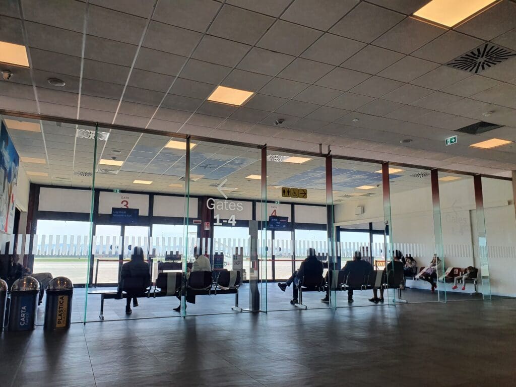 Once airside, it became evident that this portion of the terminal was most certainly not designed for any long waits. This consisted of nothing but a hall with a relatively small number of benches, a drinks and snacks vending machine and another for hot drinks, toilets and a very small number of plug sockets – with this appearing to be more akin to a bus terminal rather than an international airport. However, on the plus side, large windows along one side of this provided a good view of the apron and runway, where for the duration of my stay Diamond and Piper aircraft belonging to the local flying school, Professione Volare, could be seen passing by. Meanwhile, the terminal appeared to be in a clean state and fast complimentary wifi was also provided which I found to work well. Inside, I managed to spot large adverts and several bits of equipment belonging to the now defunct EGO Airways – a short-lived company that never commenced commercial flights, as well as Greek airline Lumiwings who appear to have halted their scheduled operations since the start of the pandemic. In dire need of a drink, as soon as I arrived I made my way over to the vending machine however I was let down to find that this only accepted coins rather than notes and cards. Defeated, I sat down on one of the few remaining empty seats.